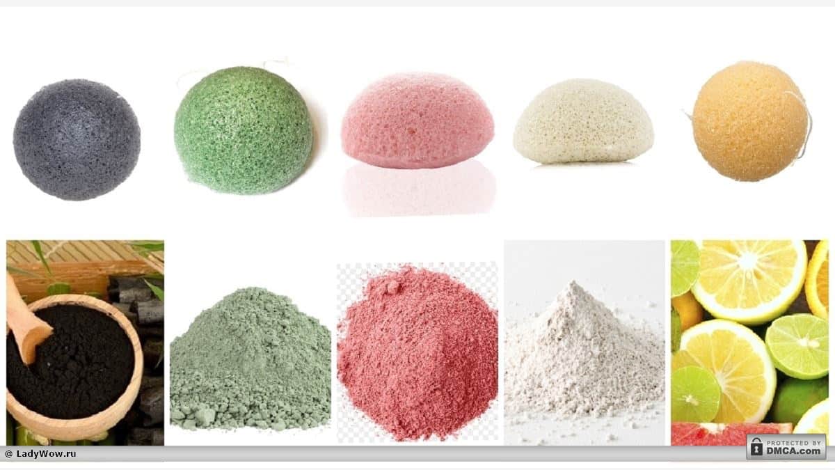 Сейчас существует несколько вариантов конжаковых губок для разных типов кожи и для решения разных кожных проблем. Производители добавляют в спонжи натуральные ингредиенты (экстракт алоэ, красная глина и т.д), поэтому губки бывают разного цвета и формы.