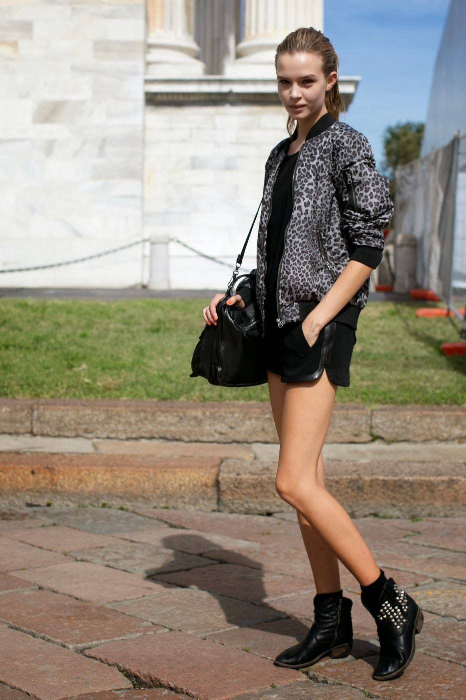 Если вы предпочитаете носить кожаные шорты с курткой из аналогичного материала, сочетайте эту комбинацию с замшевыми ботильонами, ботинками на низком ходу, кедами или невысокими сапожками.