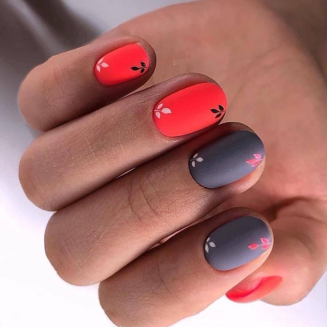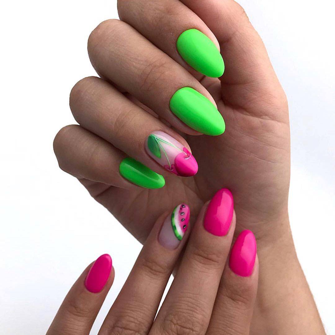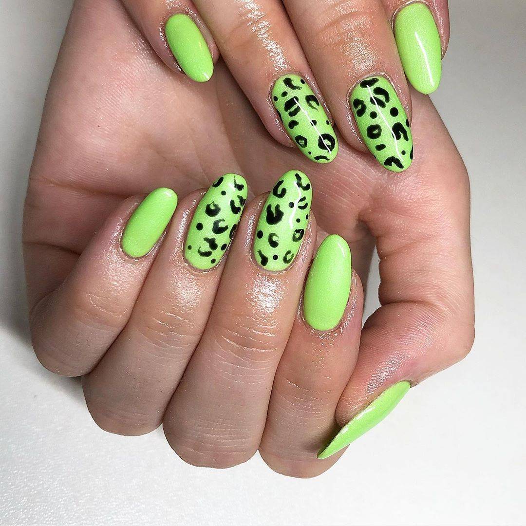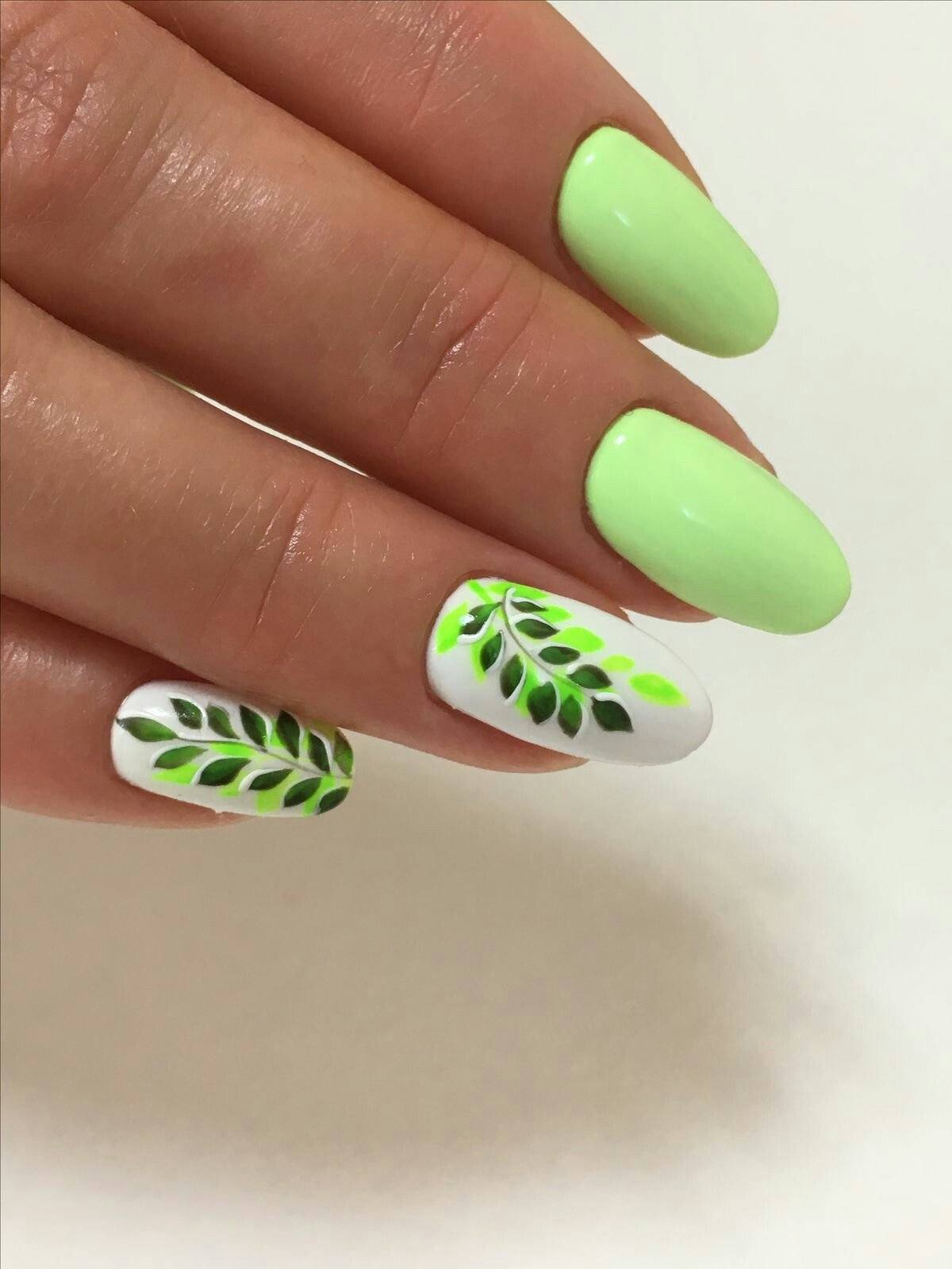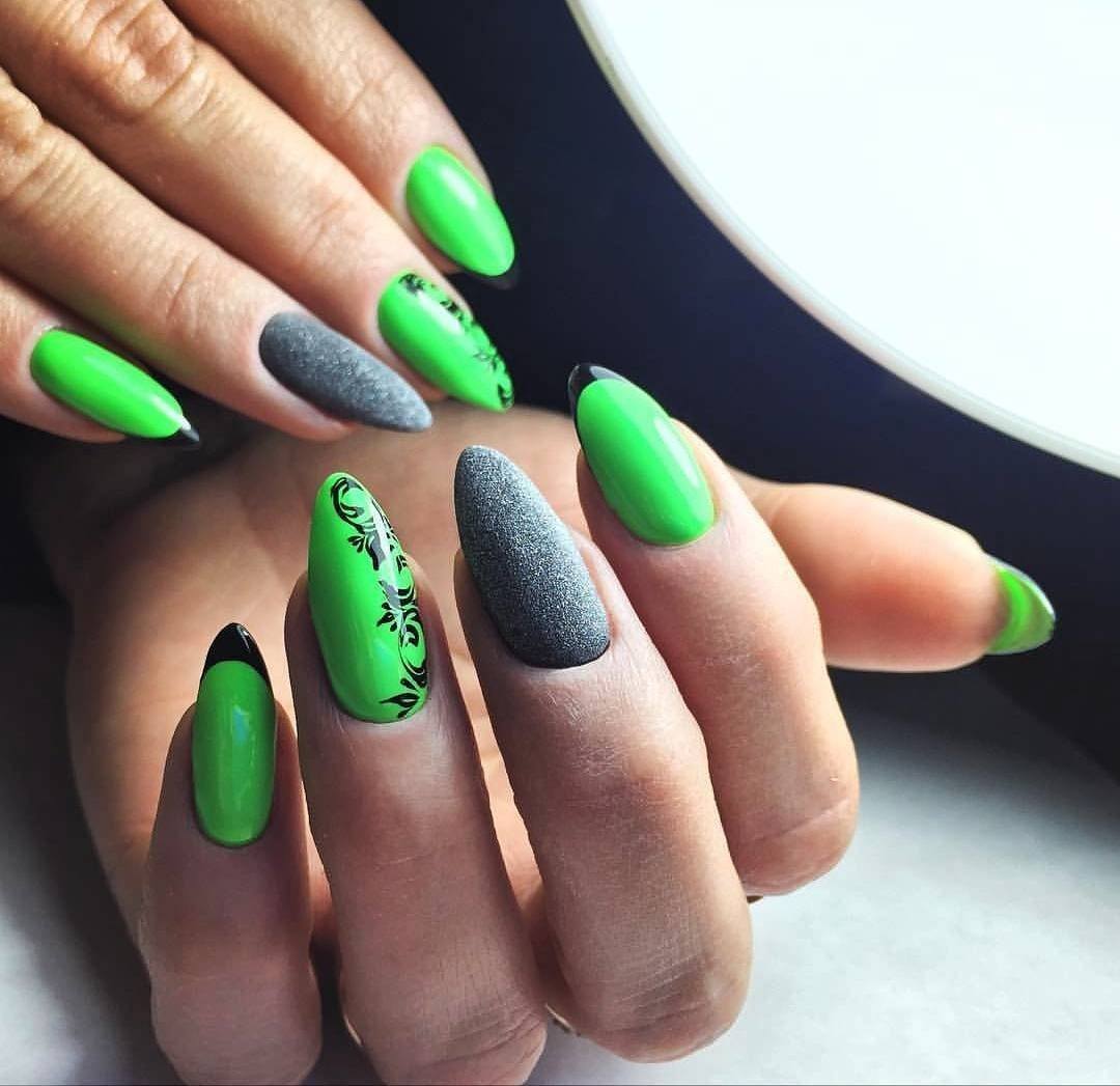 С зеленым цветом отлично гармонирует фруктовый дизайн. В тренде маникюр с фруктами в разрезе. Особенно красиво выглядит дизайн с лаймом, лимоном или апельсином. Зеленый неоновый цвет может использоваться в качестве дополнения геометрического дизайна или маникюра с флористикой. Используйте темные узоры стемпингом с веточками и листьями. На фото ниже вы можете видеть пример такого стильного дизайна ногтей.