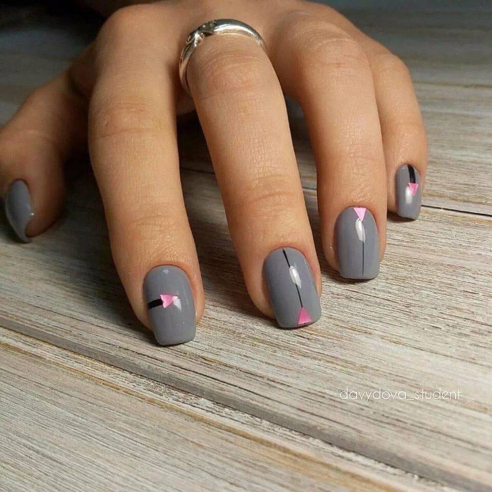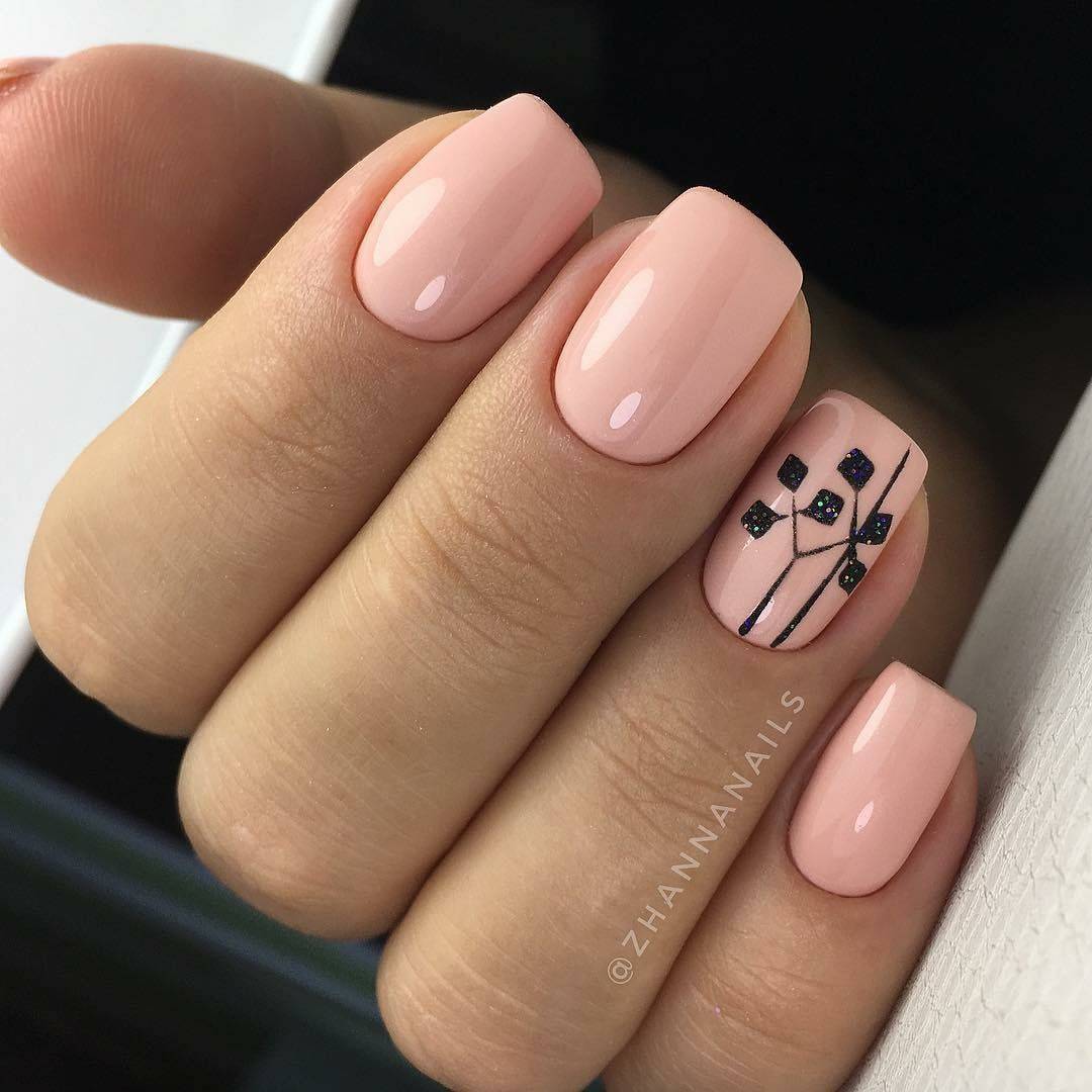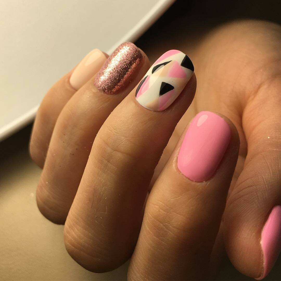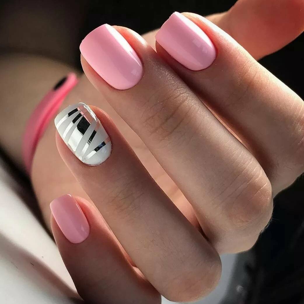 Нежно-розовые ногти можно украсить минималистичным геометрическим узором.
