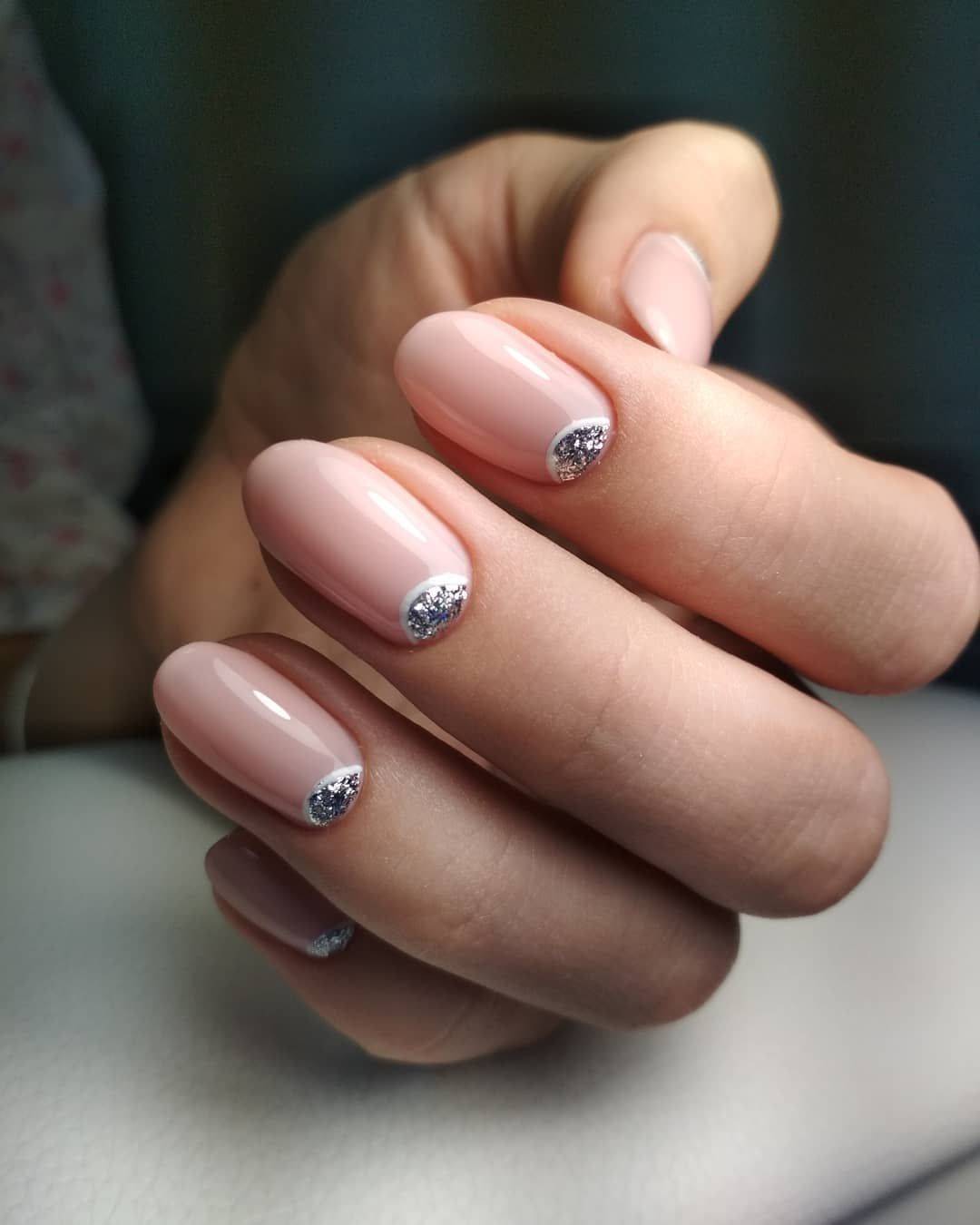 Классический лунный маникюр становится интересным, если добавить немного серебра
