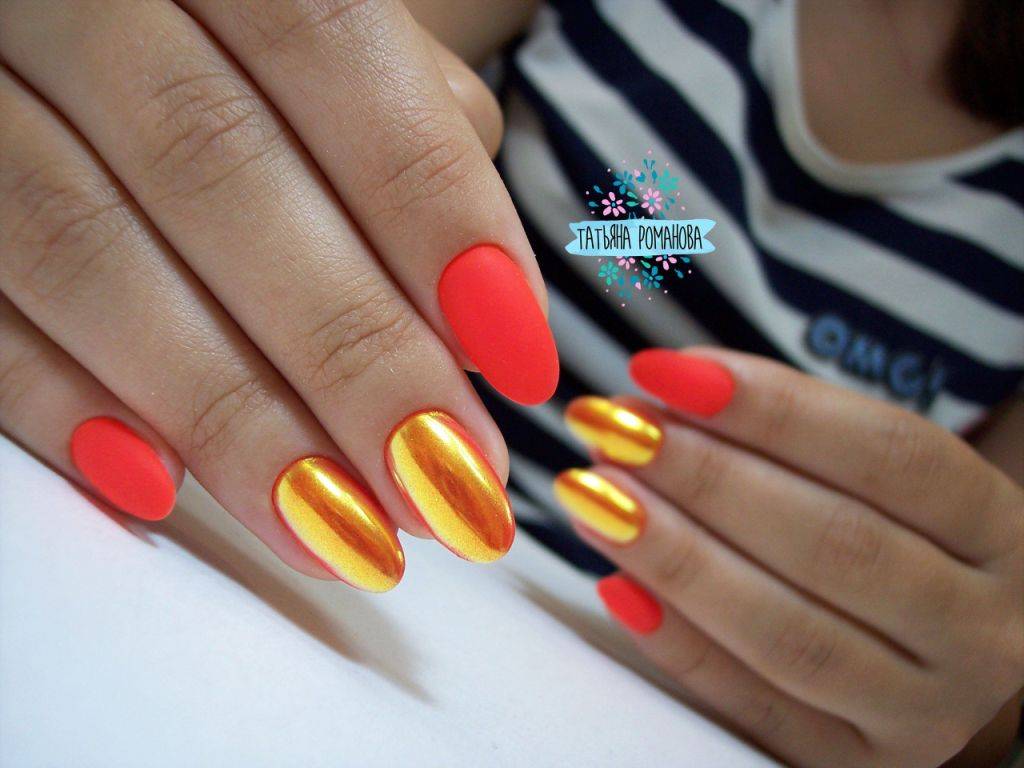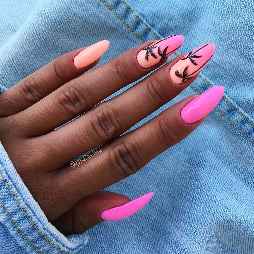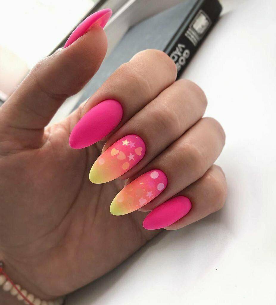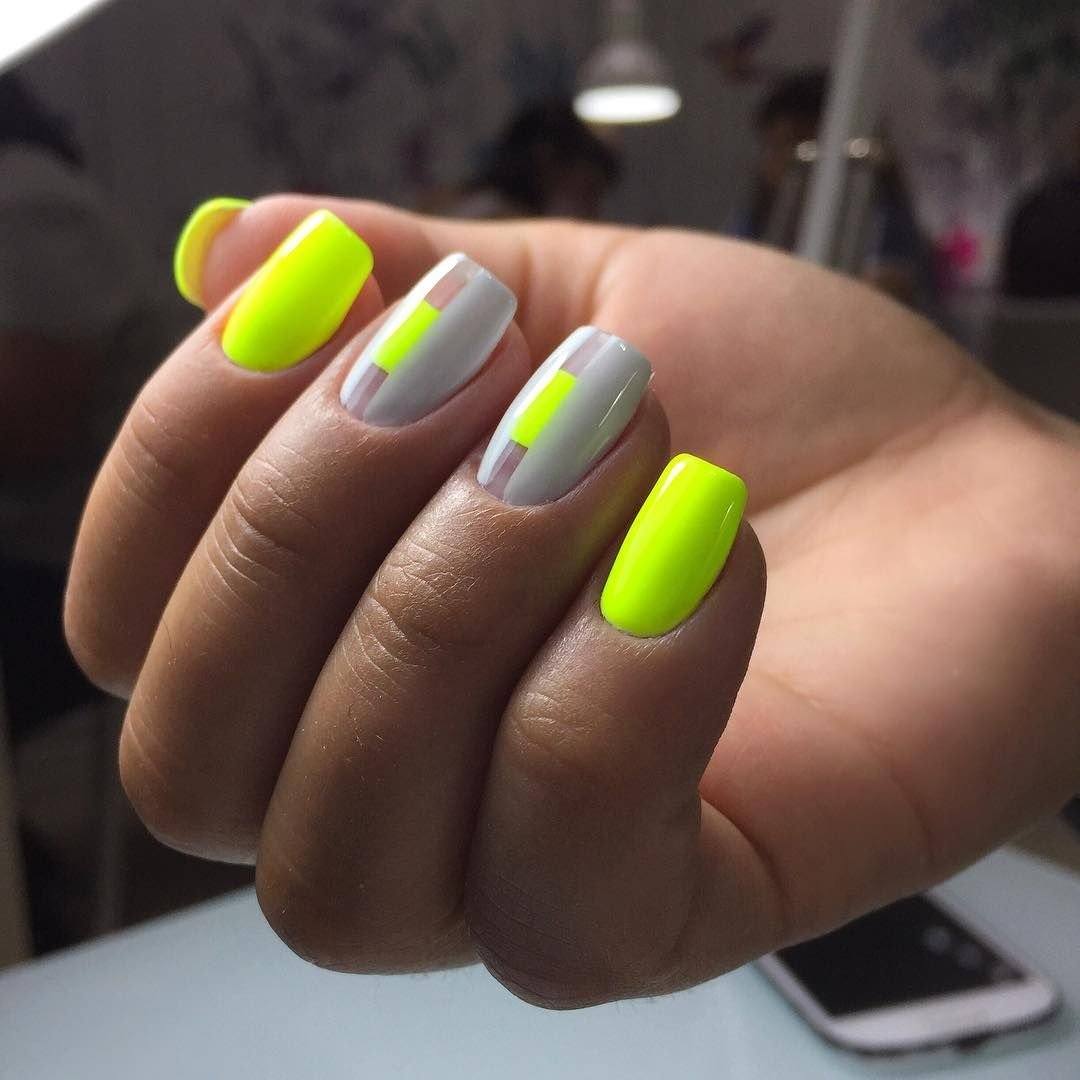 Шикарно смотрится желтый неоновый оттенок в сочетании с розовым цветом. Используйте технику “разные ручки”. Желательно не дополнять маникюр другими оттенками или декором. Неоновые тона и без того смотрятся достаточно ярко, поэтому дизайн лишь усложнит нейл-арт.