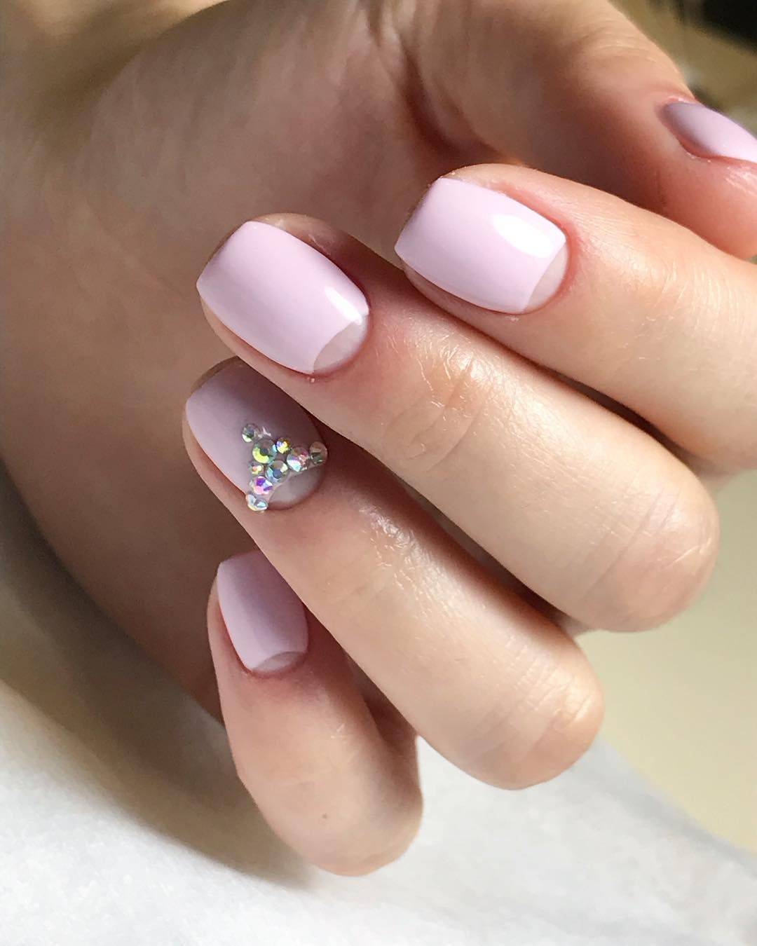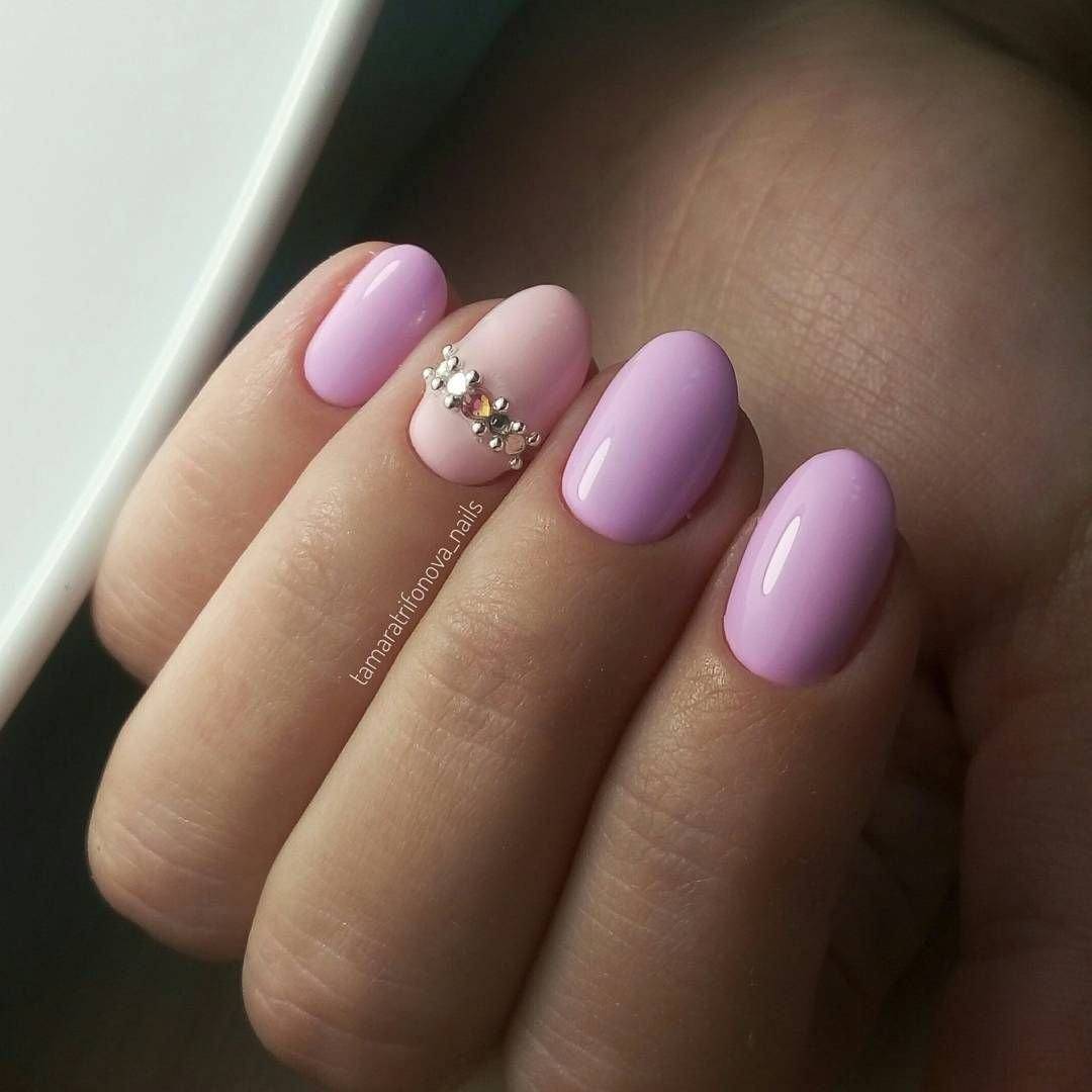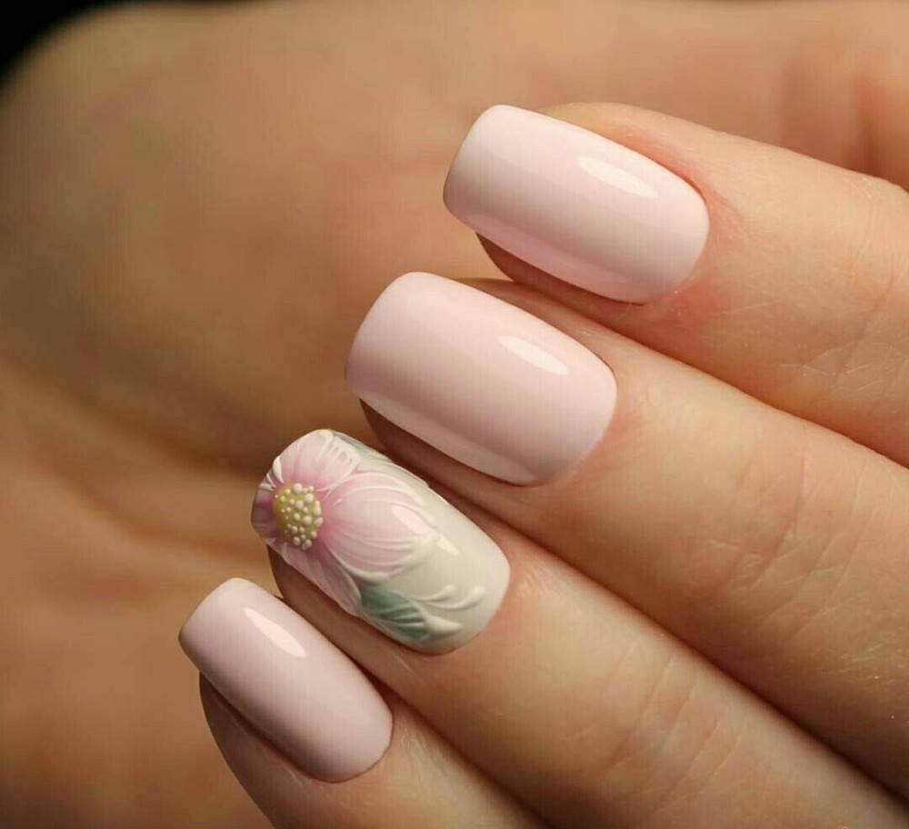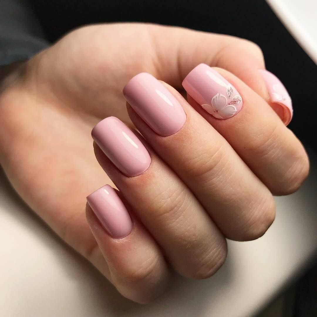 Самый простой вариант – однотонное светло-розовое покрытие. Если у вас смуглая кожа или вы недавно вернулись из отпуска с хорошим загаром – такой маникюр для вас. Несмотря на простоту такой маникюр будет выглядеть эффектно и элегантно. Можете дополнить его рисунками в пастельных тонах – например, бирюзовом или мятном.