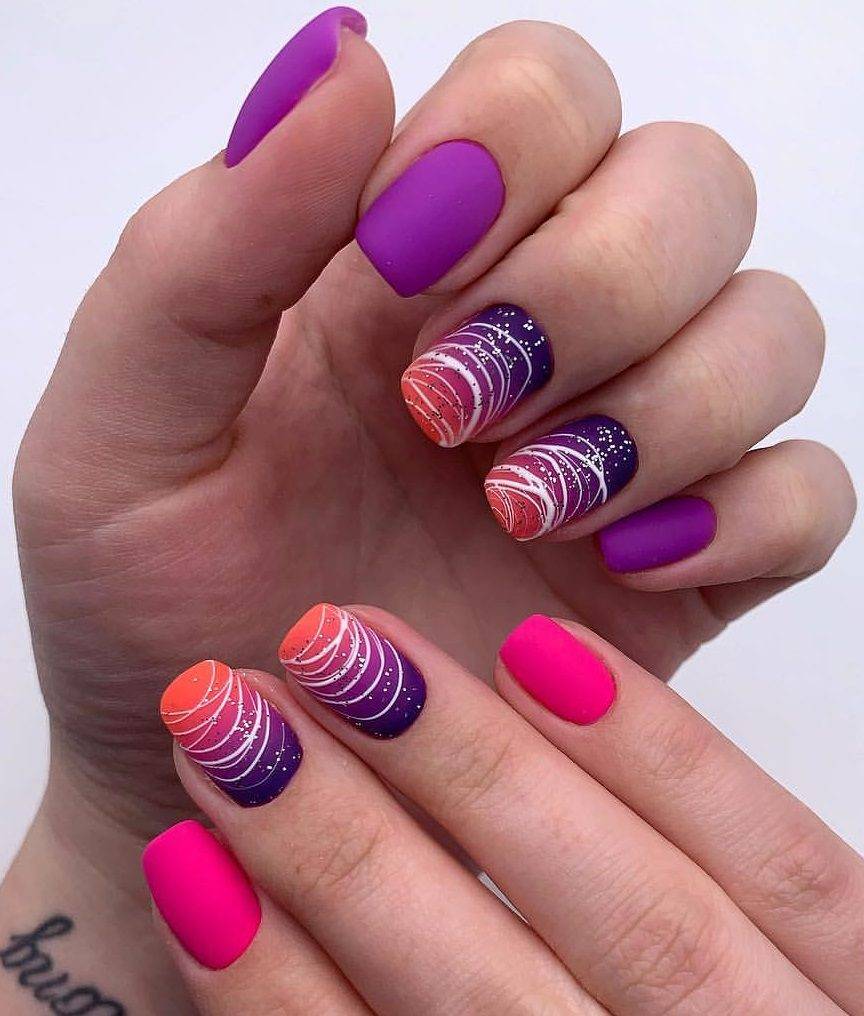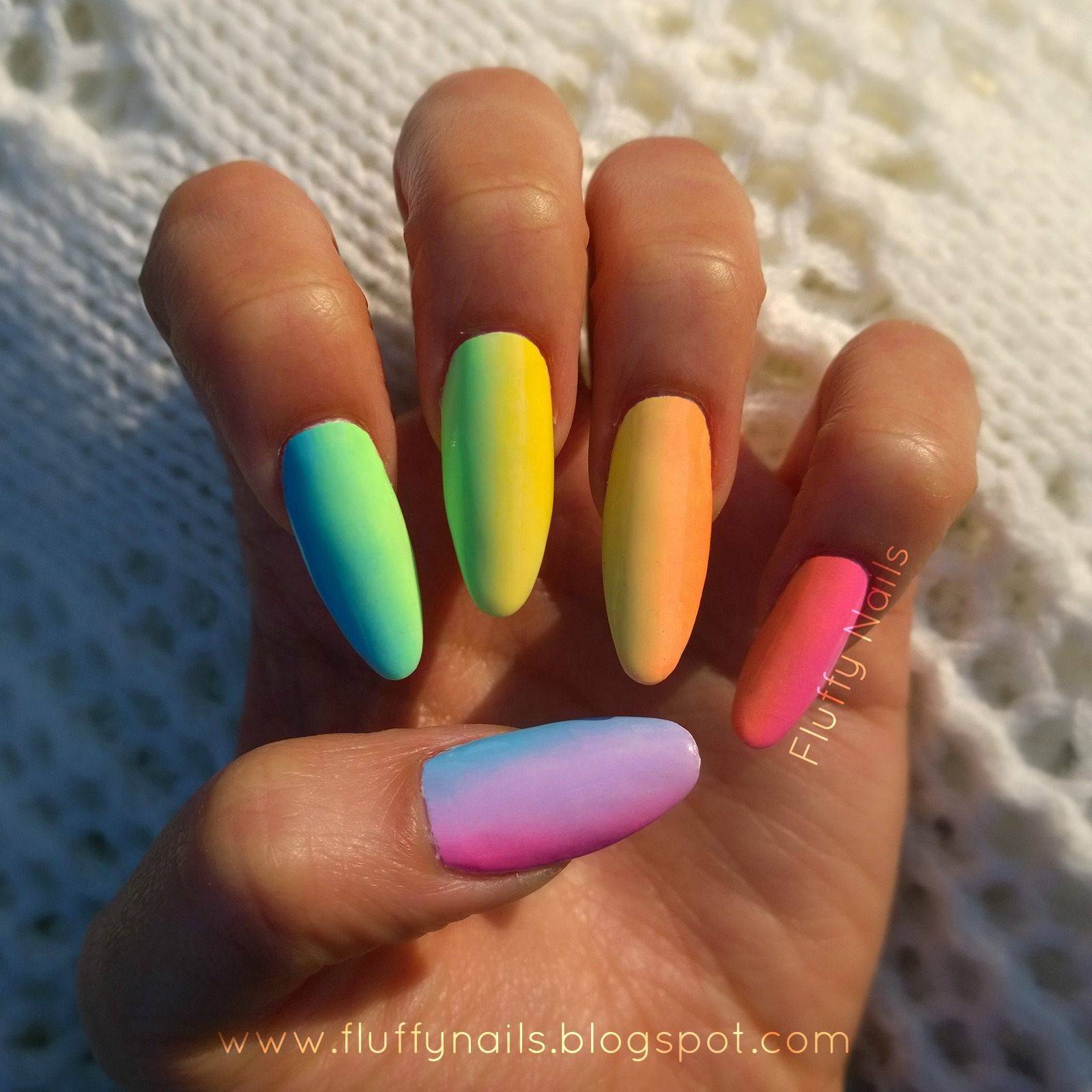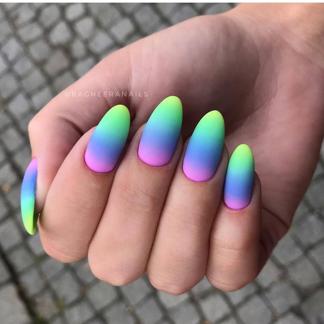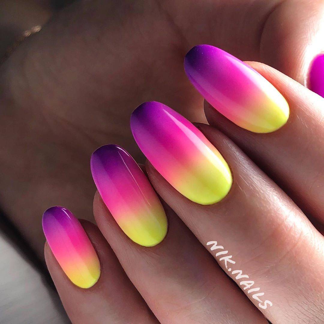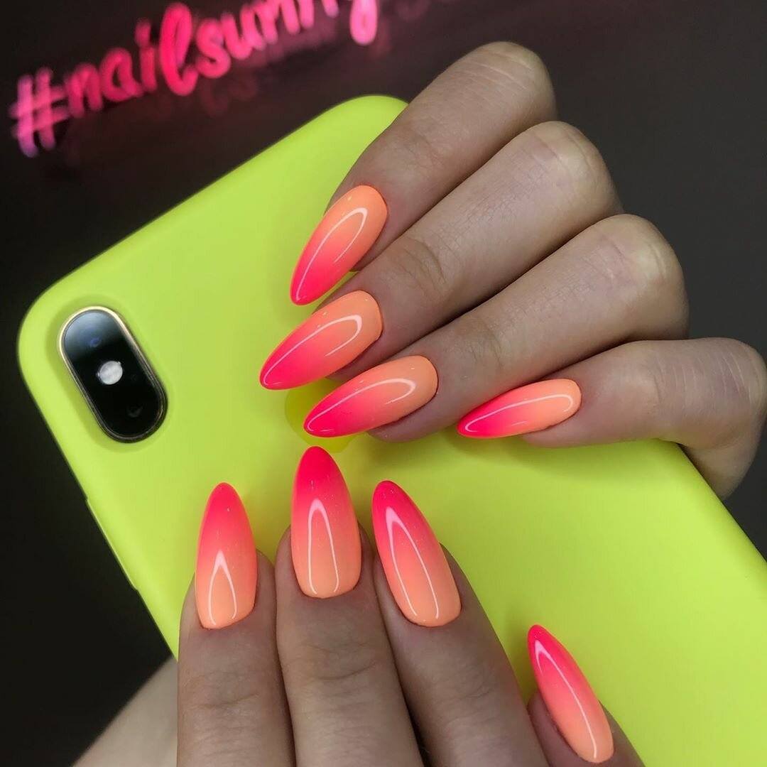 С помощью градиентного маникюра получится показать красоту сразу нескольких оттенков. Используйте все разнообразие неоновых тонов в одном нейл-арте. Яркие оттенки хорошо растушевываются и гармонируют друг с другом.