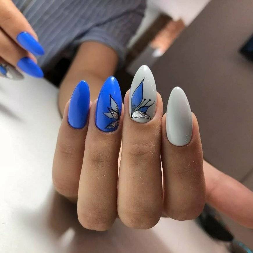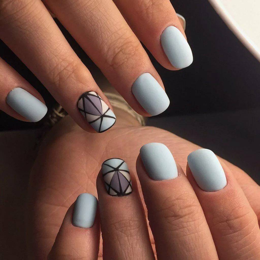 Если вы предпочли флористику, то цветы должны по цветовой палитре схожи с основным фоном. В маникюре с геометрией можно использовать серебряный или золотой глиттер, графитовый или серый оттенки. Также присмотритесь к нежному маникюру с надписями. Маникюр с серебряными словами отлично смотрится на сером или белом фоне.