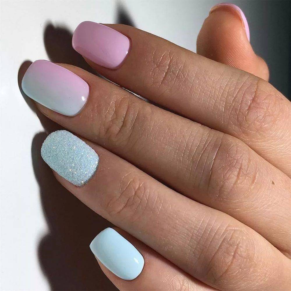 - Голубой и румяный с небольшим присутствием золотистых штрихов на безымянных пальцах.