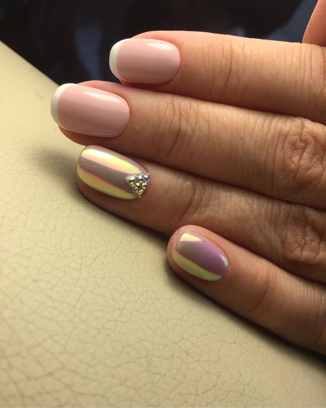 Интересное решение: выделять лунки не на всех ногтях, оставляя на других однотонное розовое покрытие.