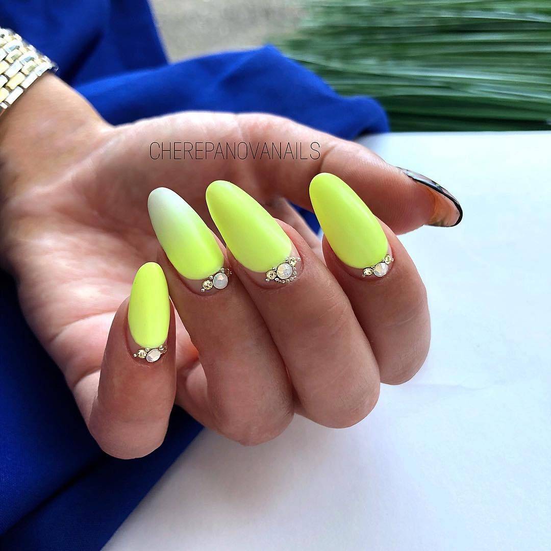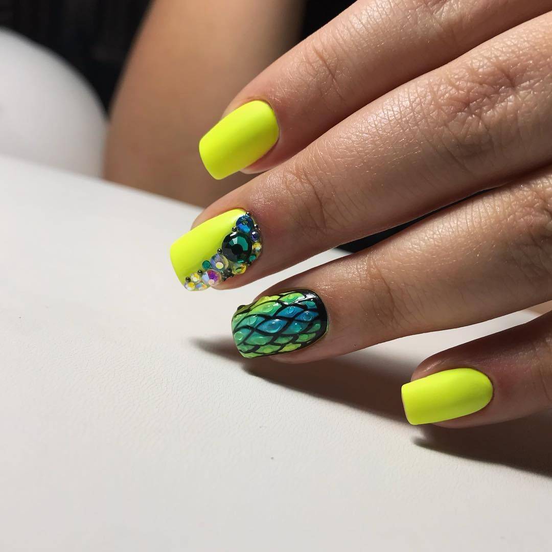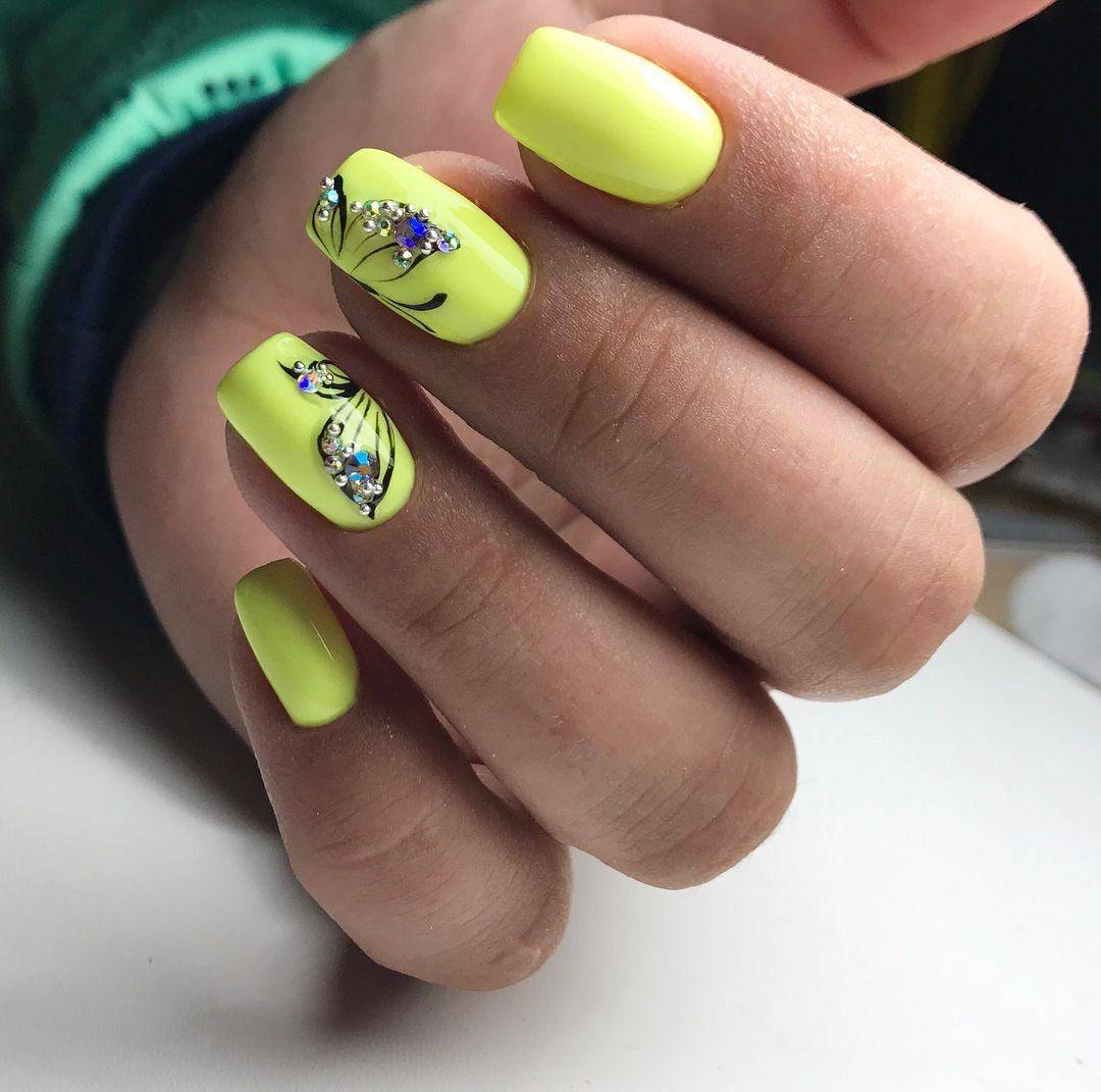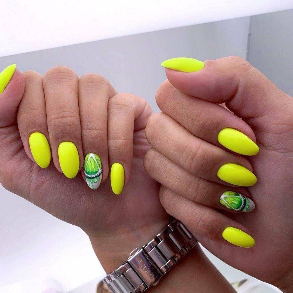 Желтый оттенок вновь на пике популярности. Мягкий и нежный цвет особенно актуален в летний период, в остальные сезоны на его смену приходит горчичный цвет. Полное покрытие ногтей неоновым желтым цветом подходит далеко не всем. Дизайн выглядит экстравагантно и очень ярко, поэтому выполнять его для повседневного образа не рекомендуется.