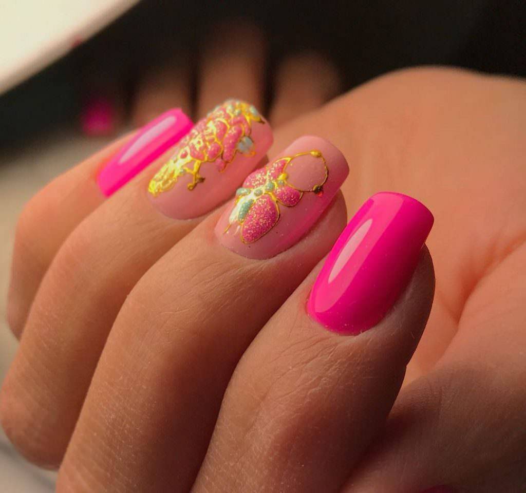 Роскошное золото в сочетании с насыщенным розовым оттенком будет привлекать внимание. Маникюр розовый с золотом будет уместен на любом торжественном мероприятии