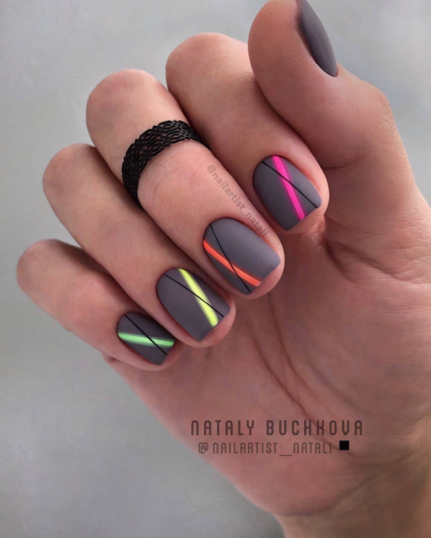 - неоновый маникюр лучше выглядит на коротких ногтях и ногтях средней длины. На длинных ногтях неоновые оттенки также могут смотреться красиво, но при условии незначительного их использования в общем дизайне.