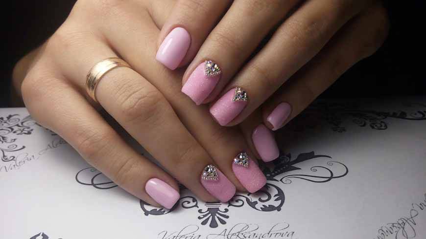 Бесподобно смотрится розовый маникюр с декорированием ноготков стразами. Такой маникюр придаст его обладательнице особого шарма. Главное правило при добавлении страз – не переборщить, чтобы маникюр выглядел аккуратно и эстетично. Уместно будет посадить на уголок или основание каждого ноготка по одной стразе. Красиво будет смотреться орнамент, выложенный стразами. Рисунок выкладывается различными линиями любого направления. Это могут быть горизонтальные и вертикальные полосы, прямые линии. Также можно выложить стразы по диагонали, дугой или ломаной линией.