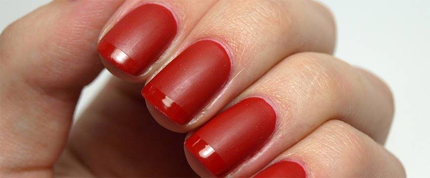 Использование красного цвета любого оттенка сильно подчеркивает форму и размер ногтевой пластины. Такая работа должна быть выполнена очень аккуратна, в противном случае будут очень видны все недостатки рук. Перед непосредственным нанесением лакового покрытия выполняется обработка баффом, и пластина покрывается бесцветной основой.