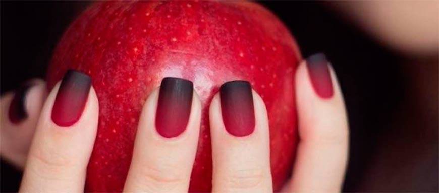 Одним из самых оригинальных решений считается нанесение покрытия в градиентной технике, при котором у основания ногтя наносится черный цвет, плавно перетекающий в красный.