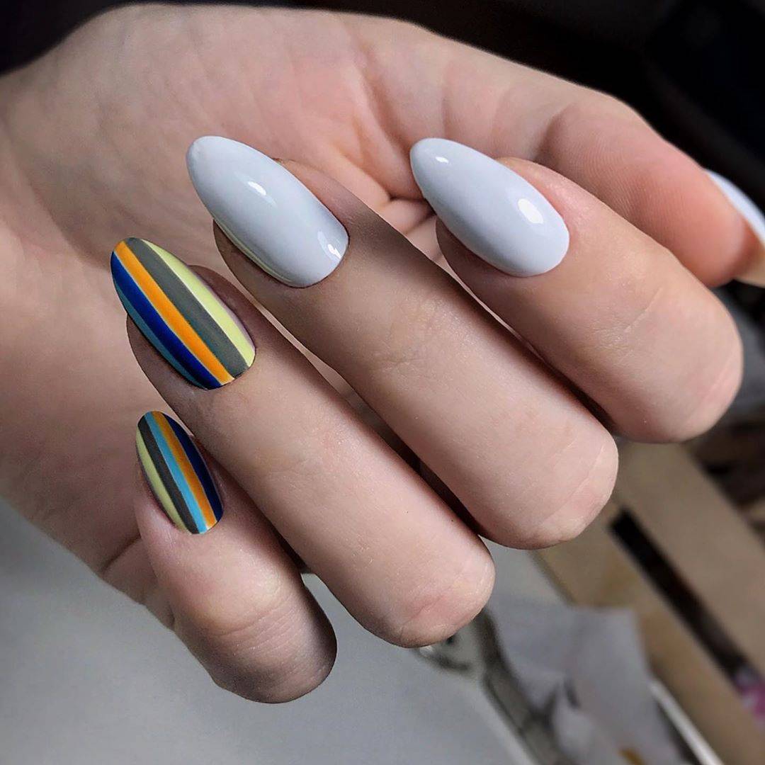 Маникюр в стиле импрессионизма — это новый тренд 2020 года. «Мини-картины» на ногтях готовы удивить своей необычностью и в редких случаях странностью. Однотонные кляксы и яркие линии наносят на прозрачную основу для ногтя. Ровная геометрия и полоски — абсолютный аналог стилю из прошлой темы. Если вы любительница простых рисунков и внятных форм, то данный стиль должен приглянуться вам. Поперечные полосы и длинные линии по всей зоне ноготка — это современный тренд нейл-арта в 2020-2021 году.