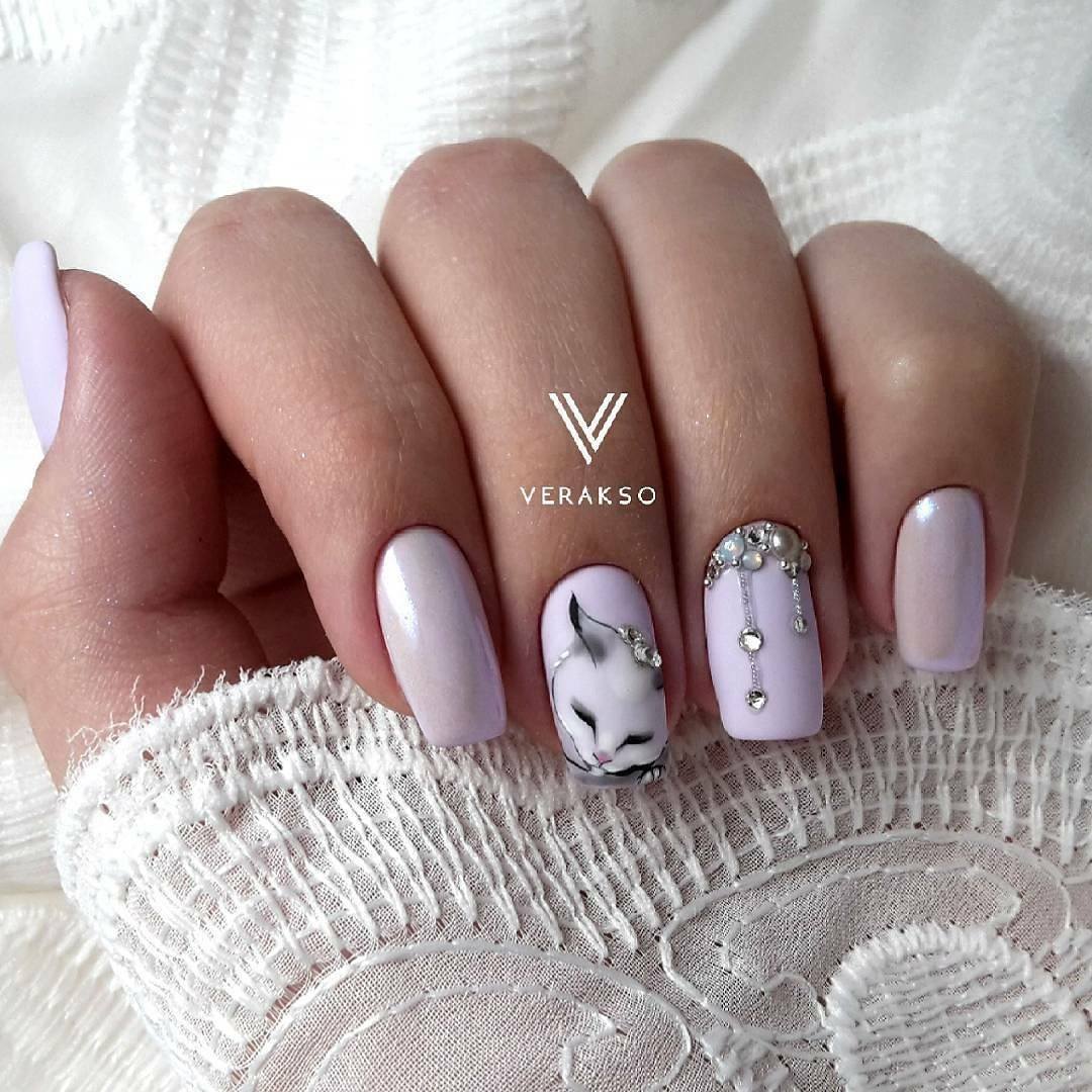 - дизайн с кошками нельзя назвать универсальным. Он великолепно выглядит на свидании, романтической прогулке или в отпуске. Для офиса необходимо подобрать маникюр более лаконичный в плане цвета и декора.