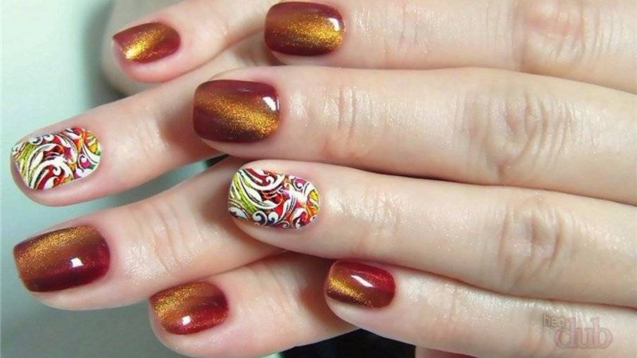 Для осеннего нейл-арта подходящими будут оттенки серого, коричневого, грязно розового, золотого цвета с соответствующими для этого вида орнаментами.