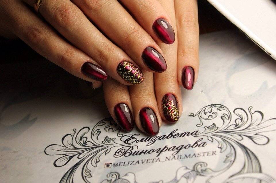 Особенно интересно маникюр выглядит в вишневом, сливовом и фиолетовом цвете. Это наиболее популярные оттенки нынешнего сезона.