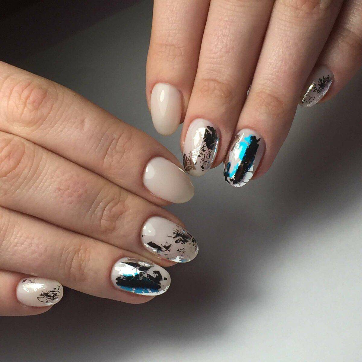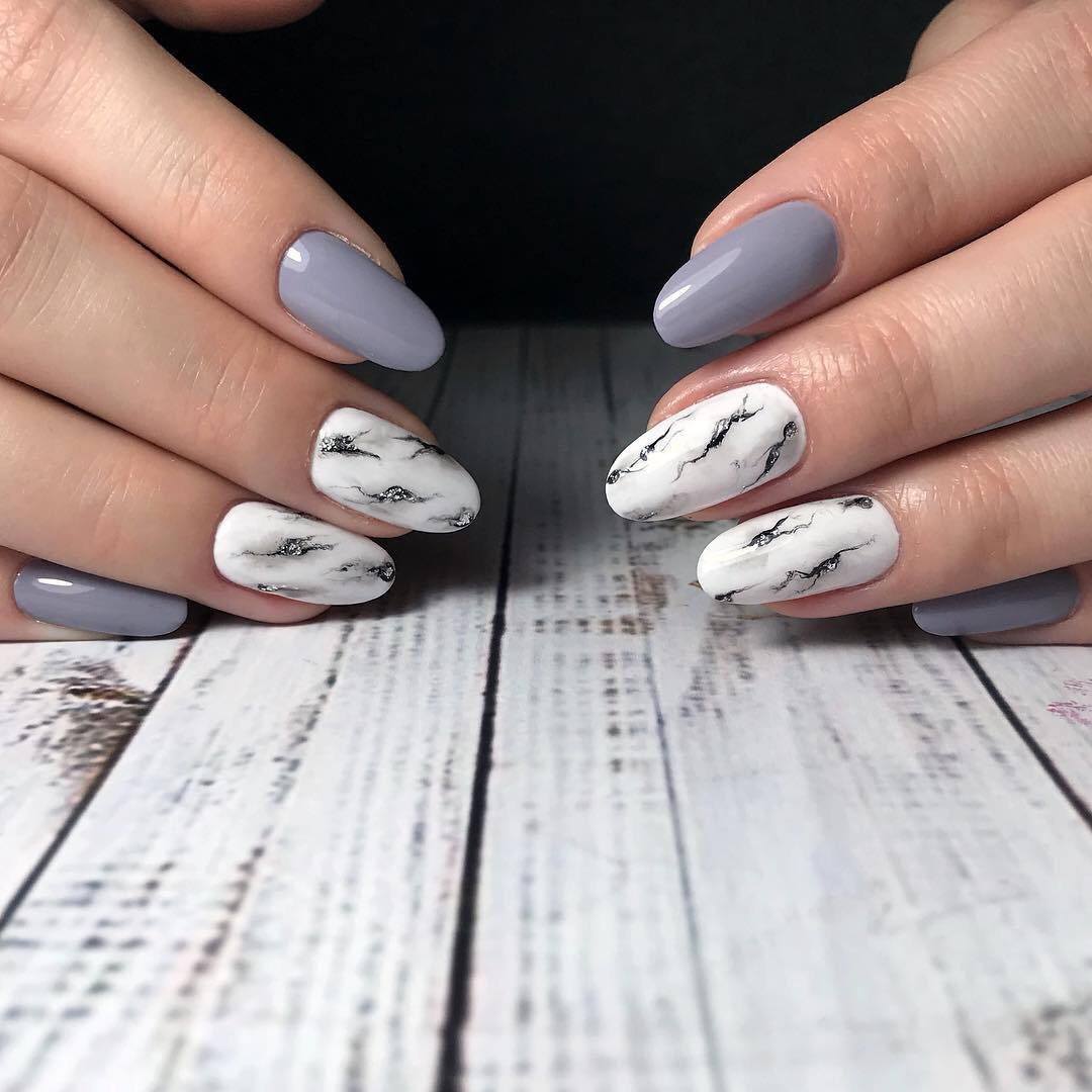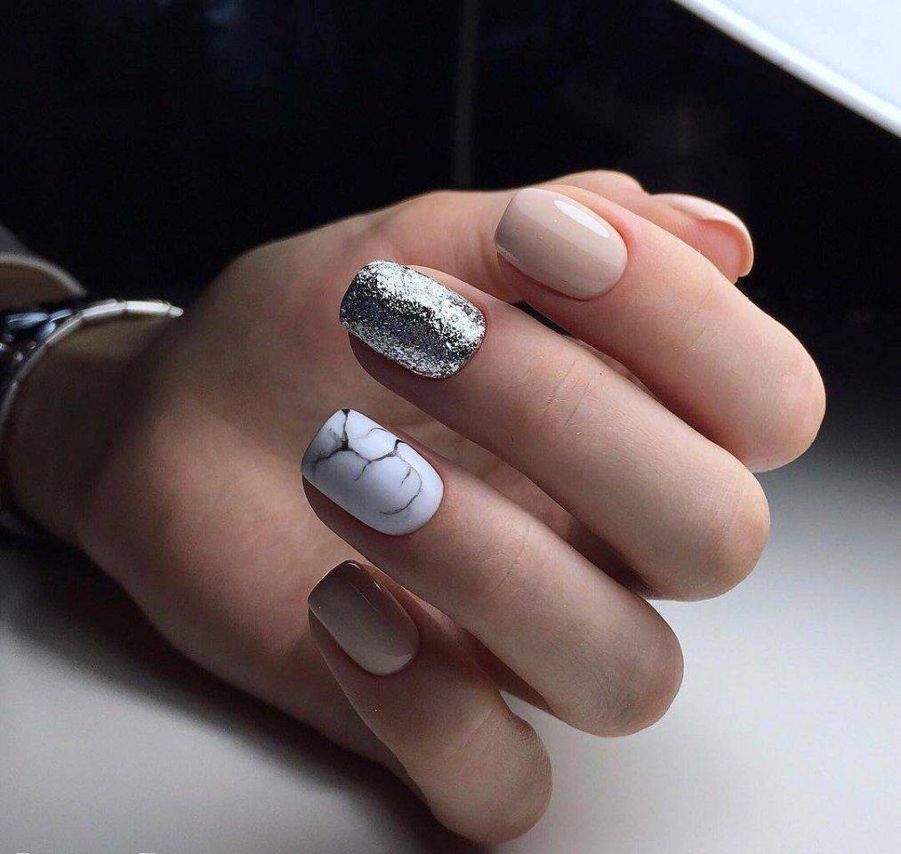 - мраморный маникюр с фольгированными полосами – серебряные полоски делают мраморный маникюр менее плоским и тусклым. Полоски вносят в дизайн яркие нотки, которые так необходимы матовому серому покрытию.