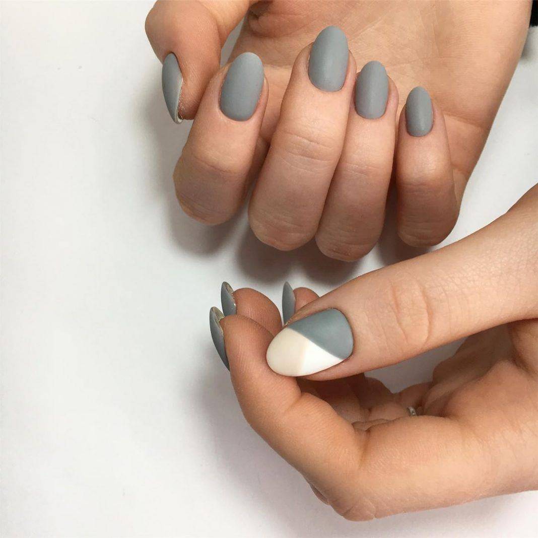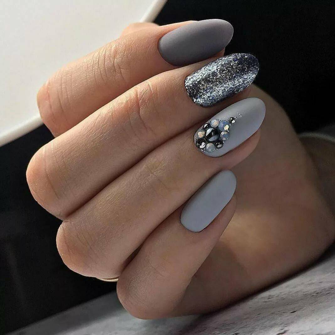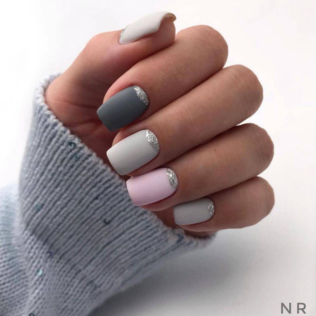 - мраморный маникюр с фольгированными полосами – серебряные полоски делают мраморный маникюр менее плоским и тусклым. Полоски вносят в дизайн яркие нотки, которые так необходимы матовому серому покрытию.
