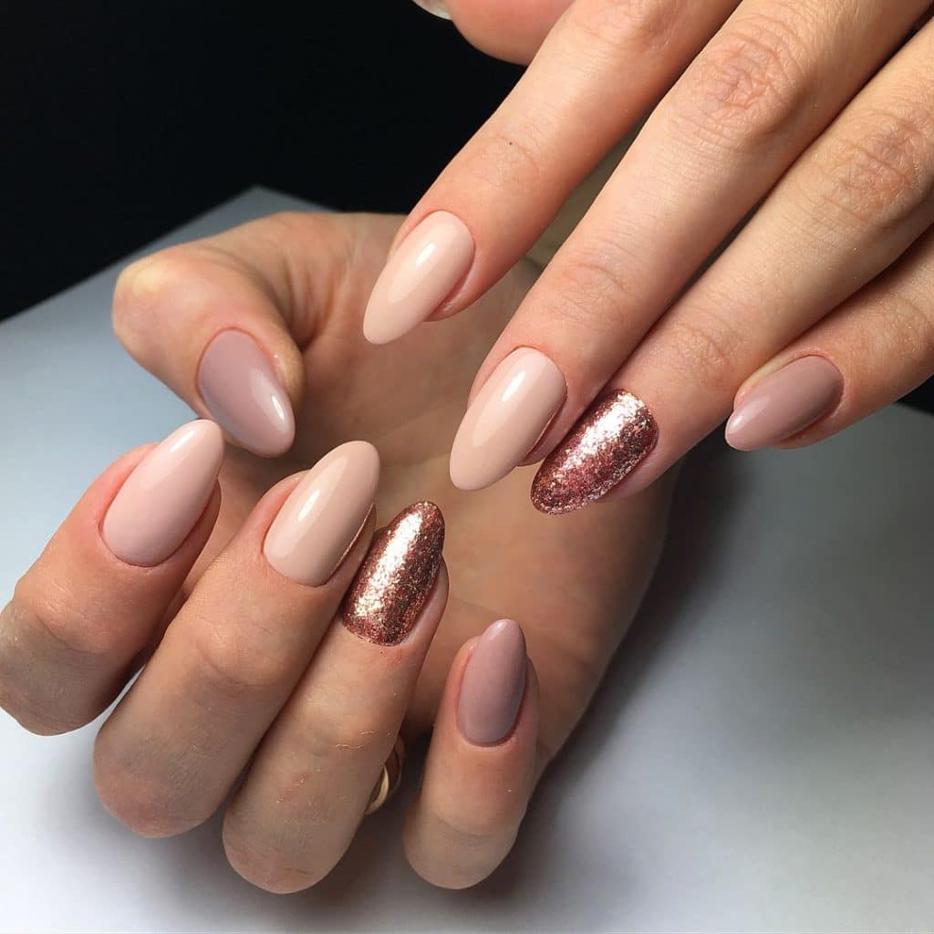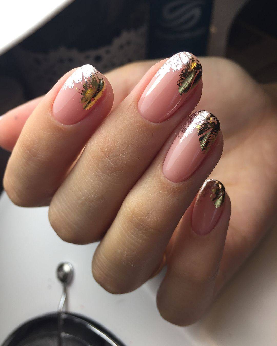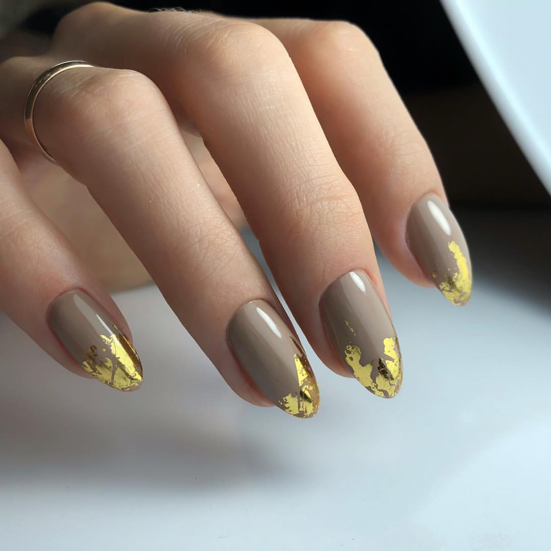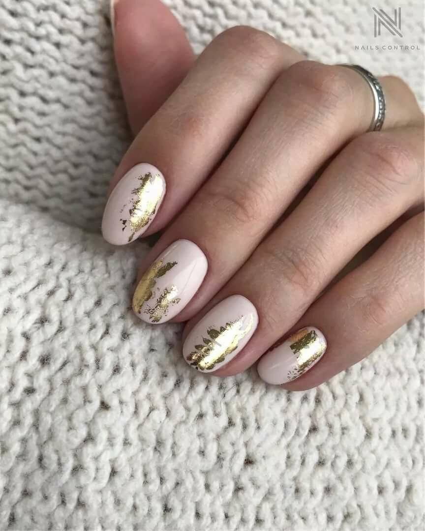 - однотонный маникюр с оттиском фольгой на безымянном пальце – универсально, но при этом не банально. Фольга отлично гармонирует со светлыми оттенками: бежевым, розовым, светло-голубым, и с темными тонами: бордовым, черным.