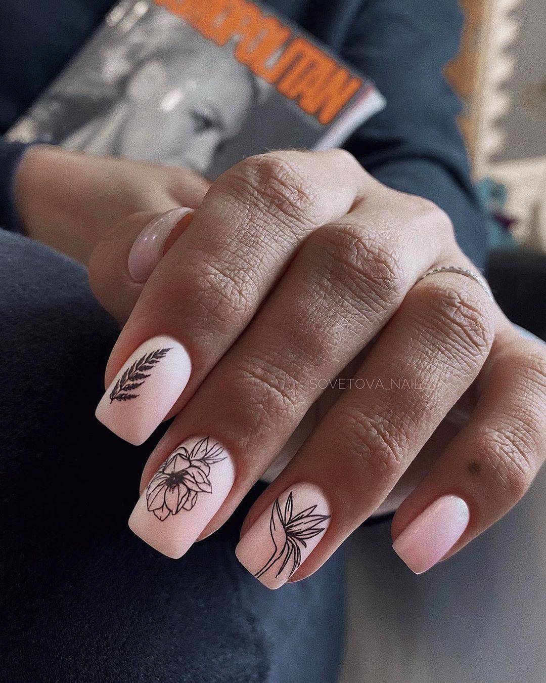 Чтобы подчеркнуть хороший вкус, необходимо избегать сложных принтов, рисунков и декора. На ногтях укороченной длины лучше рисовать тоненькие веточки, листочки, мелкие геометрические рисунки, фигуры, тонкие изящные линии.