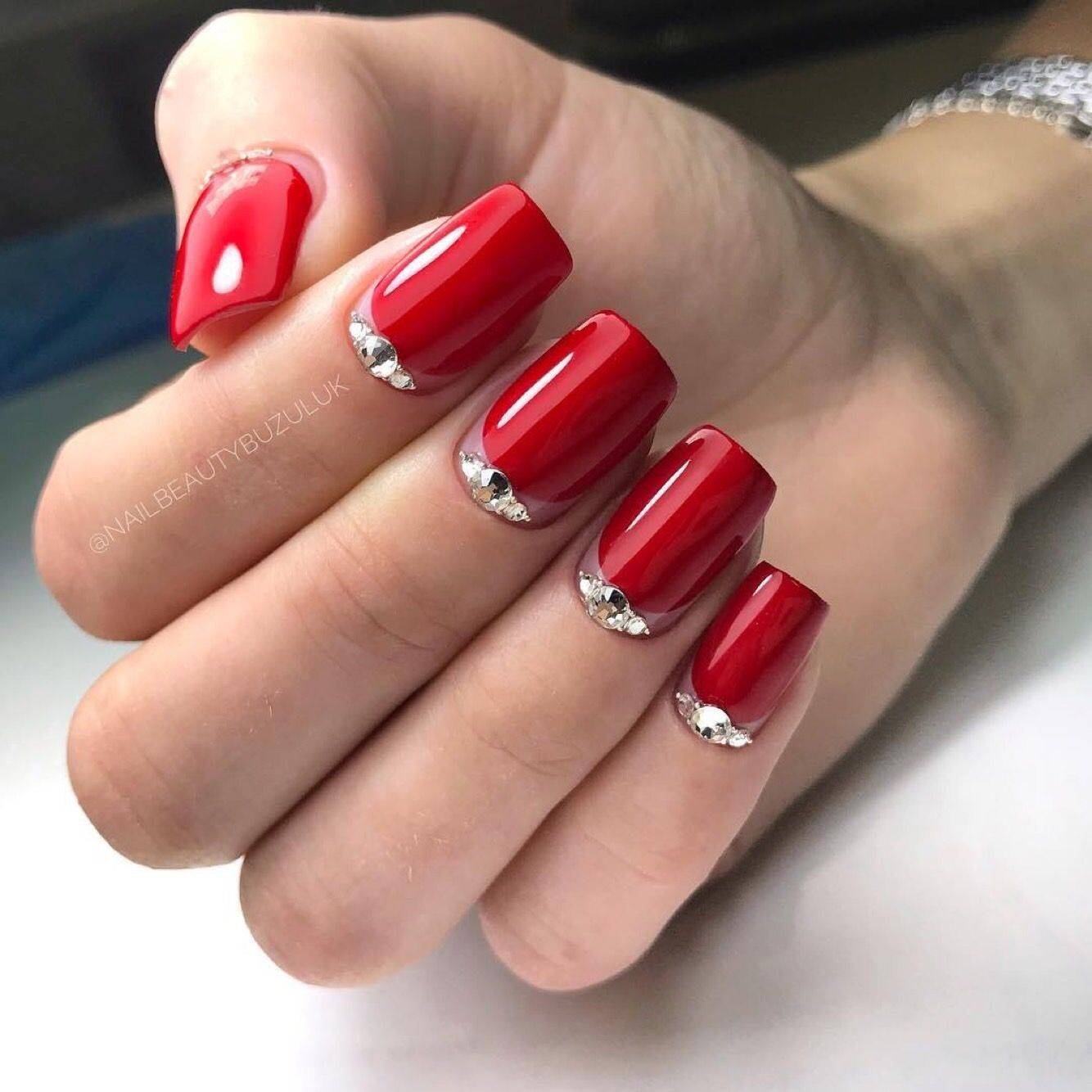 Выполняйте однотонное покрытие и акцентируйте внимание на прикорневой зоне с помощью серебряных, золотых, черных камней. Если вы решили выполнить красный маникюр со стразами, то не рекомендуется дополнять его каким-либо дополнительным декором, иначе маникюр будет смотреться слишком сложно и насыщенно