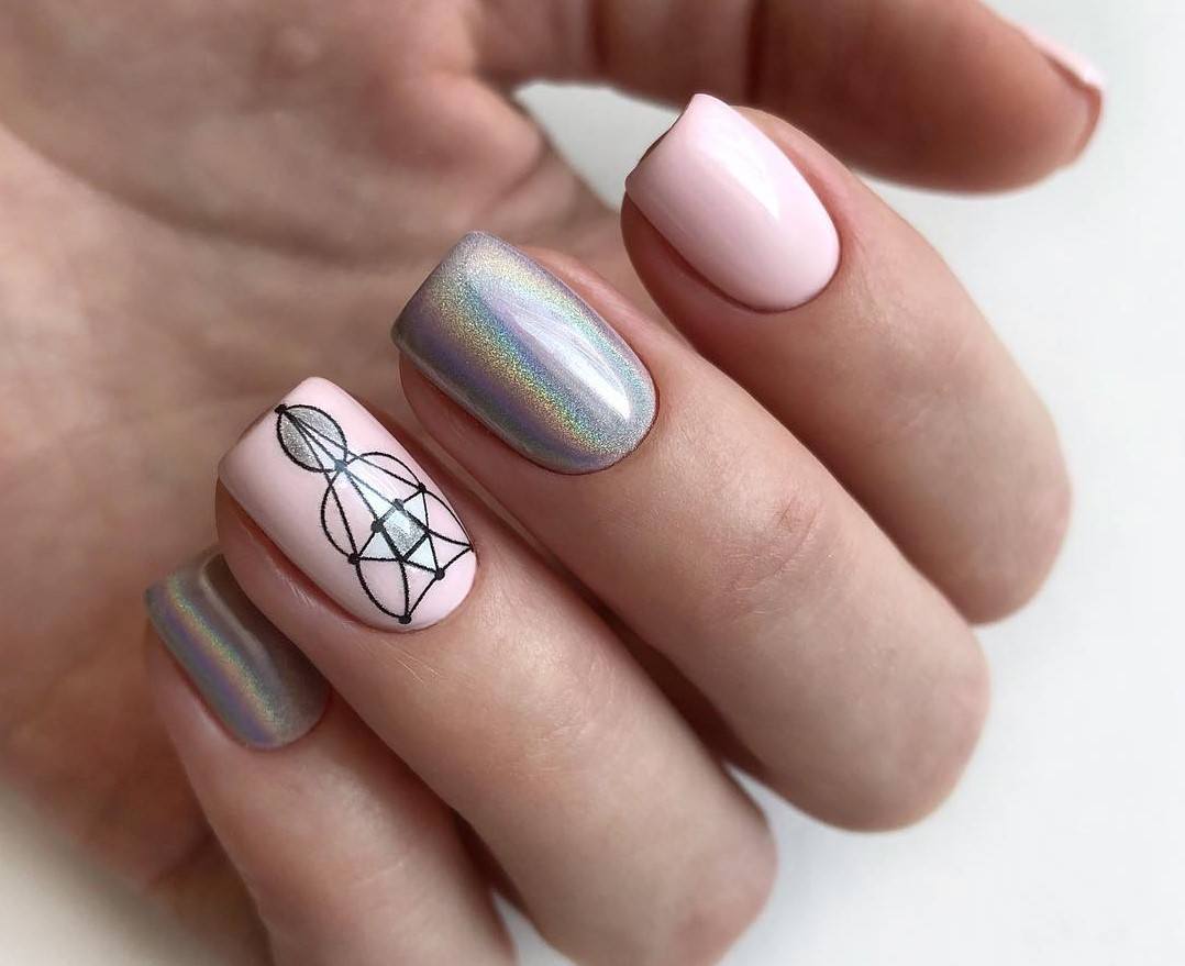 Сочетание серого и розового часто используют в геометрическом маникюре. На розовом фоне красиво выглядят полоски серого цвета. Еще одним шикарным дополнением серо-розового тандема считается серебряный глиттер. Он внесет в нейл-арт яркие и заметные нотки, сделает его выразительнее.