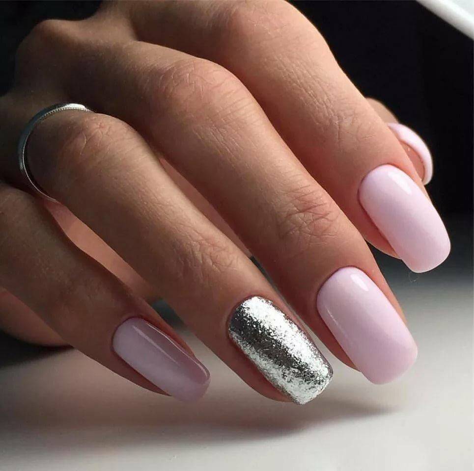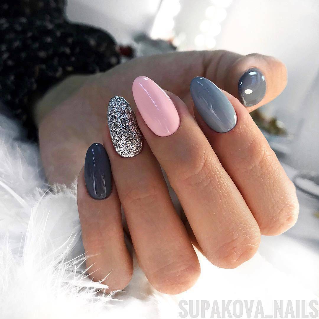 В тренде выделение глиттером одного ноготка на руке, нейл-арты с сухими блестками, френч и лунный маникюр с выделением глиттером прикорневой зоны и края ногтя. Серый цвет по колористике схож с серебряным оттенком, поэтому он будет уместно и красиво выглядеть в тандеме с розовым. Используйте для нейл-артов с серебряным глиттером светло-розовые оттенки: лососевый, розовое кружево, бледно-розовый, пастельный розовый.