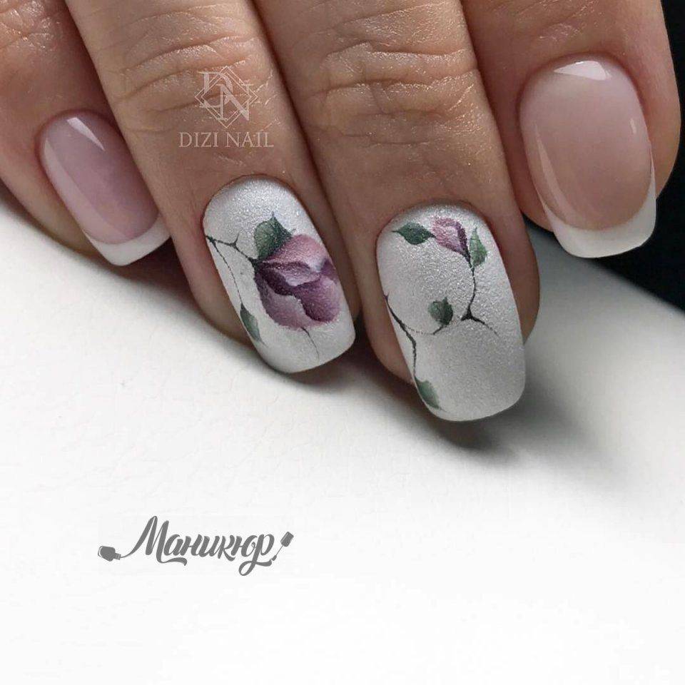 - для весеннего френча используют тематические рисунки, например, цветов, бутонов, веточек, листьев;