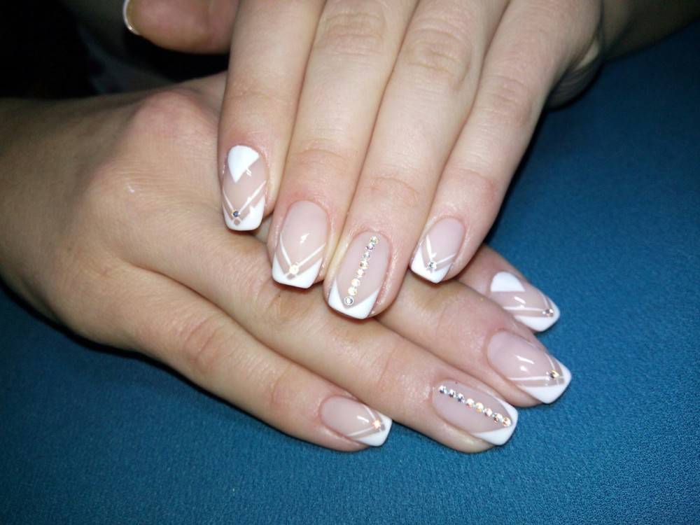 - Фан-френч. Французский маникюр с использованием дополнительных элементов оформления – имитации камней, наклеек, фольги, бульонок.