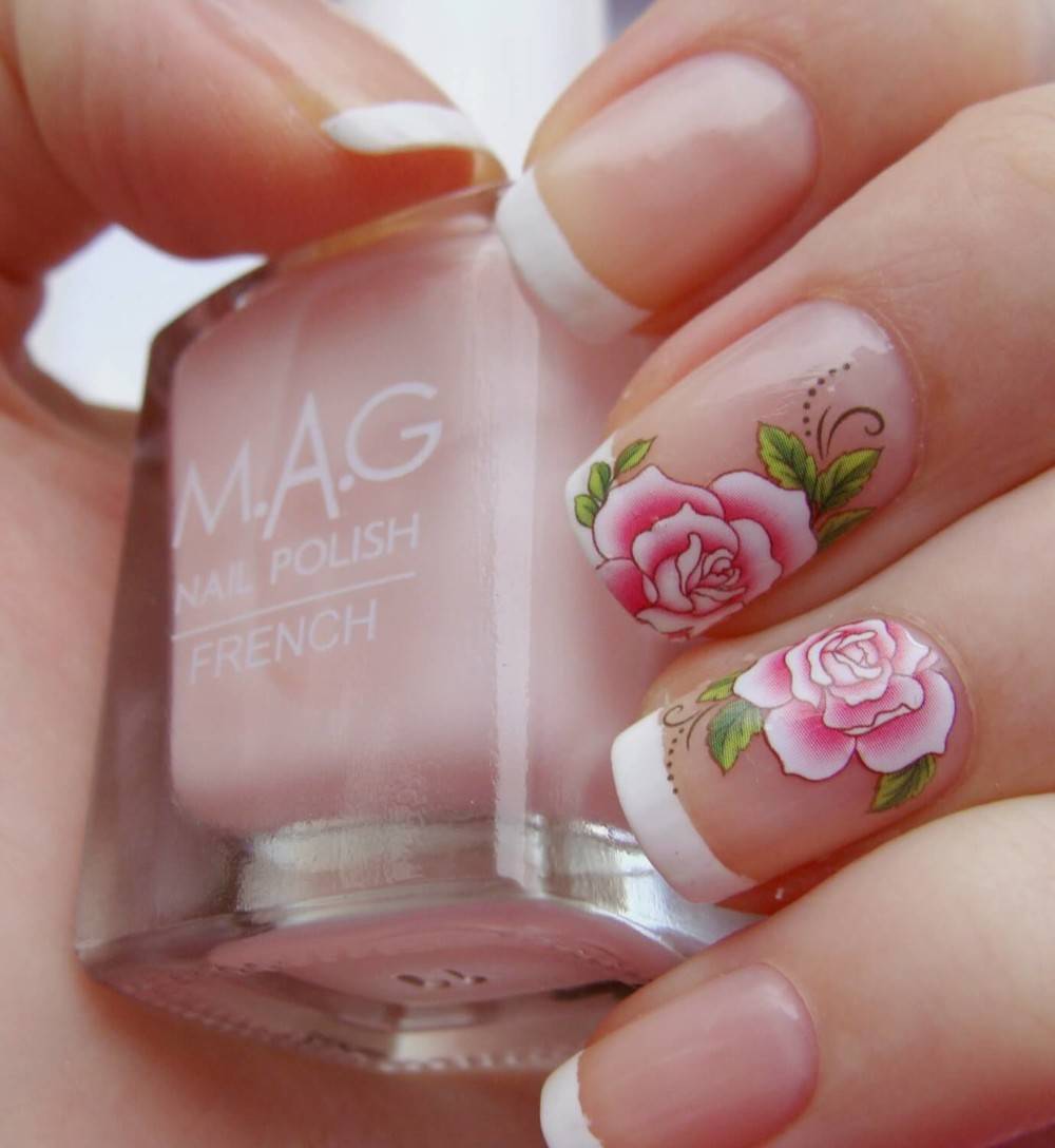 Кончик ногтя часто дополняют объемными рисунками и обилием страз, блесток, фольги и прочего блеска. Красиво смотрится френч с прозрачными картинами из цветов, созданный с помощью водных декалей. Водные декали позволяют создать потрясающие композиции на кончике ногтя, ограниченные лишь фантазией мастера.