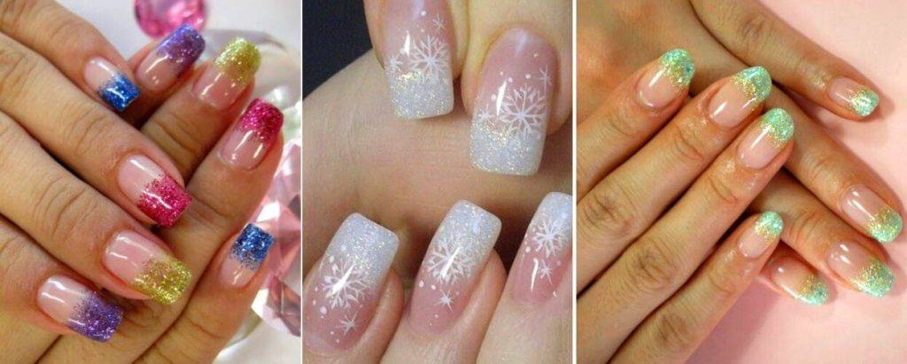 - Французский маникюр «Миллениум» создается с помощью глиттера, который наносится на свободный край.