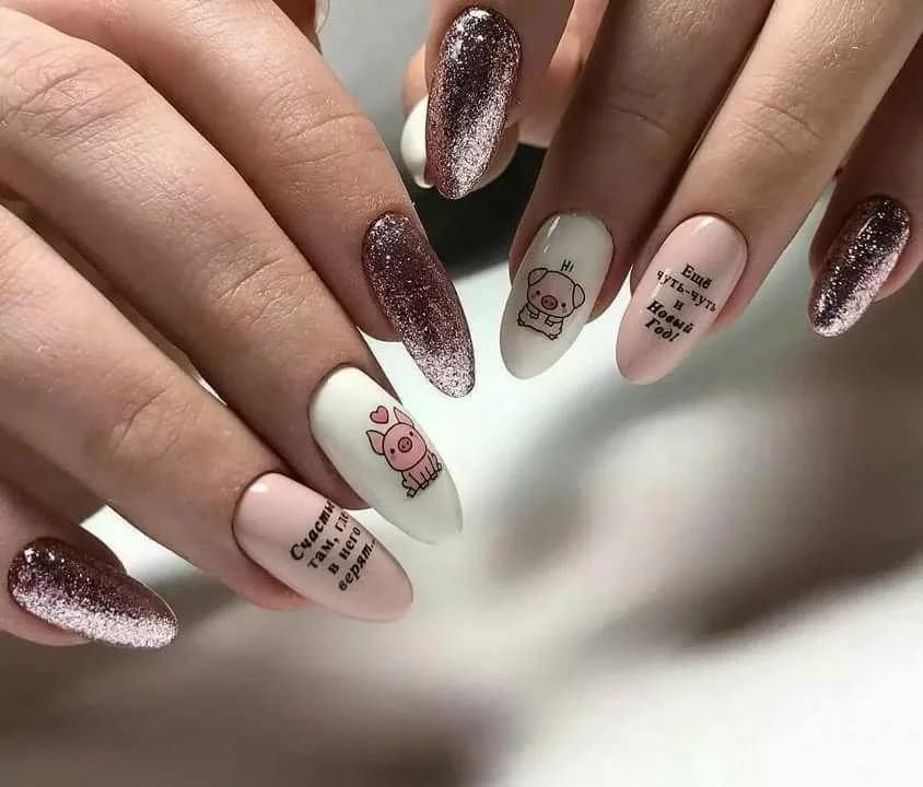 В тренде будут надписи как на отдельных ногтях, так и на всех сразу. Чтобы сделать маникюр ещё более интересным, можно украсить его фольгой, глиттером или втиркой.