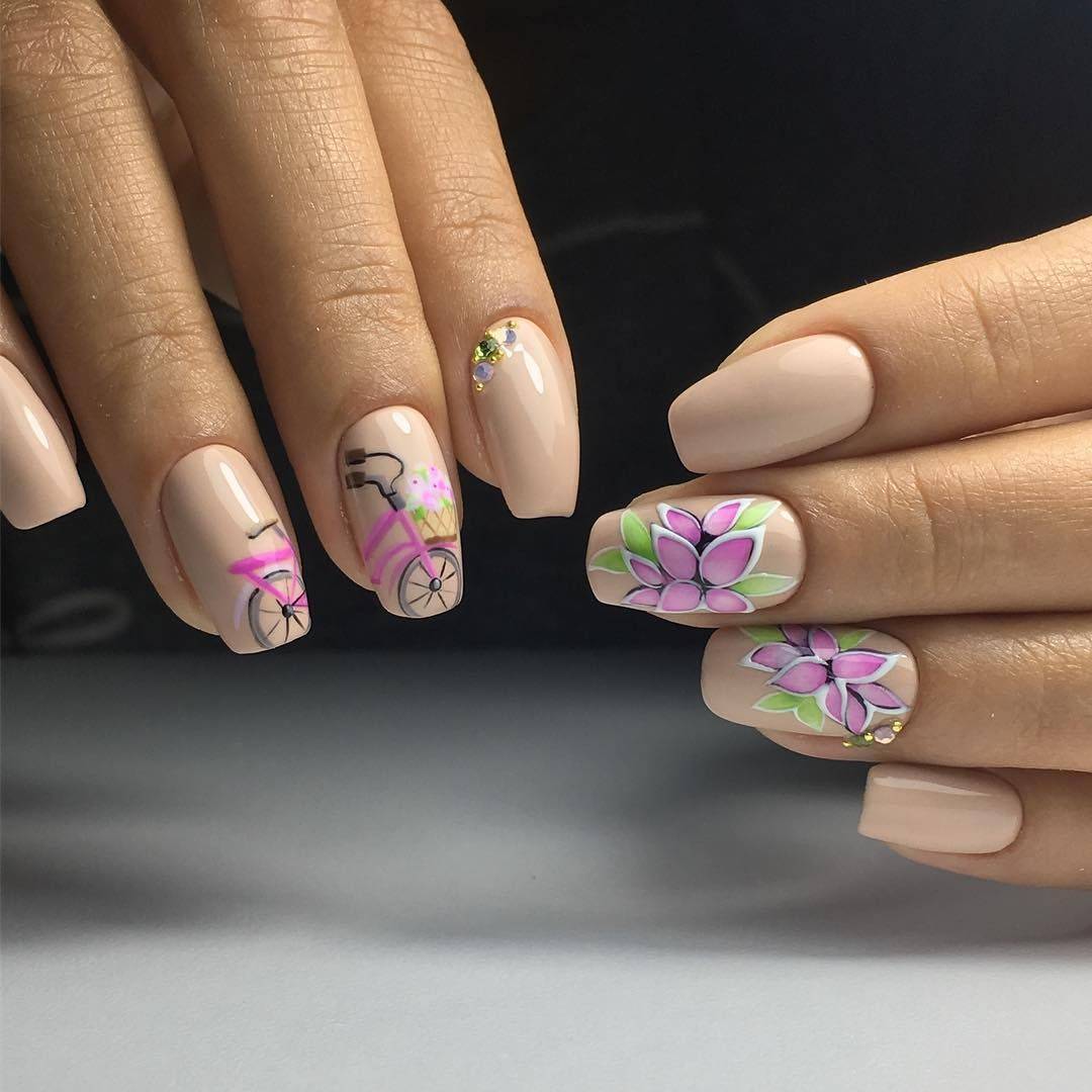 При выборе этого естественного оттенка для ногтей, редко кто задумывается о витиеватом дизайне. Чаще всего преследуется цель – ничего лишнего, минимализм и максимальная естественность. Оригинальность маникюру могут придать простые неброские рисунки и декор. Например: