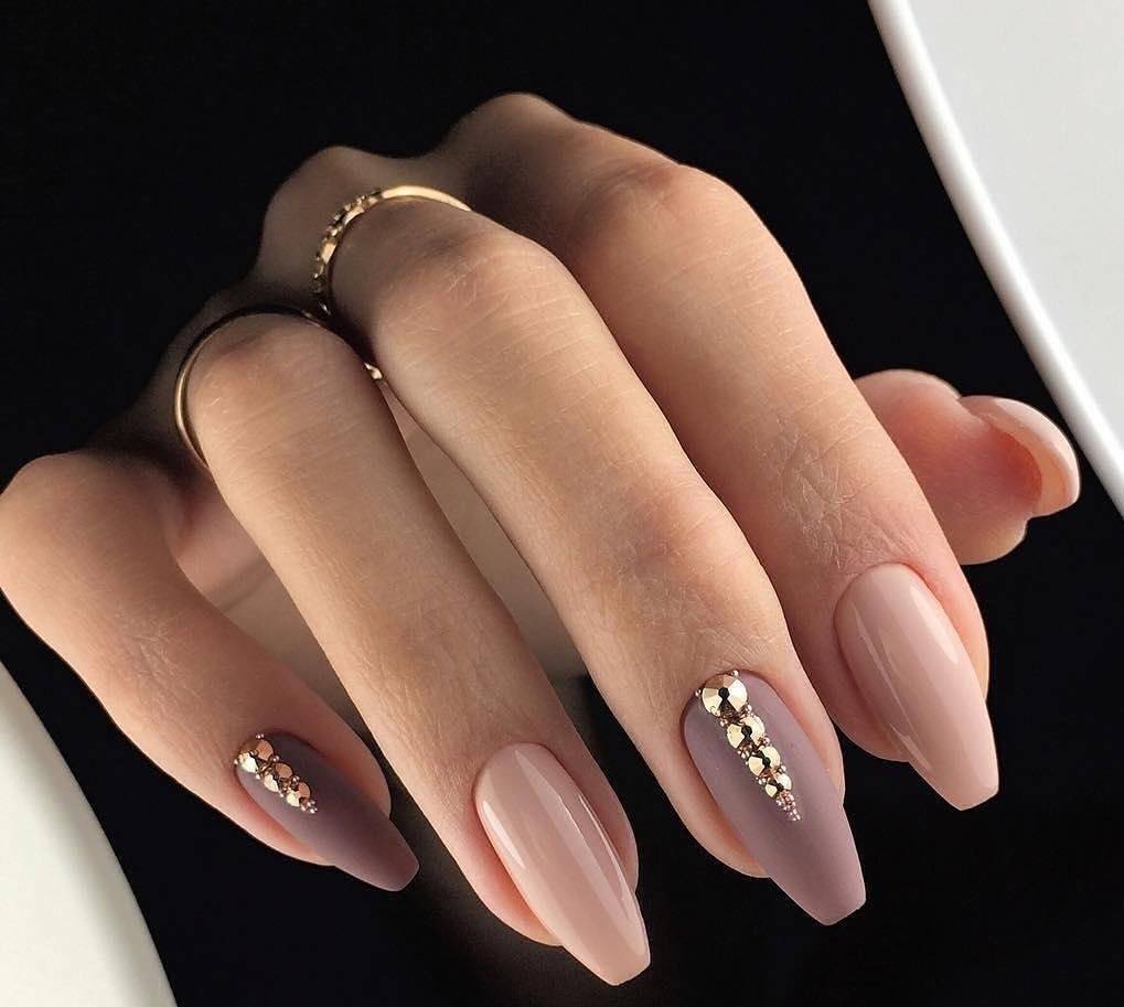 Лаконичный и женственный нюдовый оттенок идеально сочетается с золотыми акцентами. Это могут быть декорирующие изделия в разной форме, например, сердечки, стрелы, надписи, треугольники, квадраты, цепочки. Также часто усовершенствуют маникюр позолотой с помощью блеска, фольги. Самый простые, но стильные варианты: