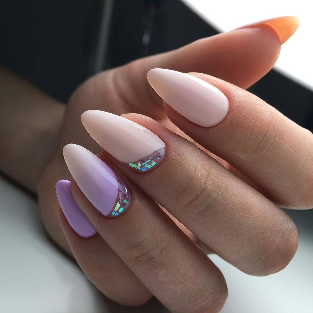 Белый, лавандовый и фиолетовый. Нежное и необычное сочетание, которое позволит по-другому взглянуть на нюдовый маникюр. Ногти выкрашиваются в хаотичном порядке, главное, чтобы цвета были из одной гаммы. Сверху их можно покрыть жемчужной втиркой, которая будет красиво играть при солнечном и искусственном свете