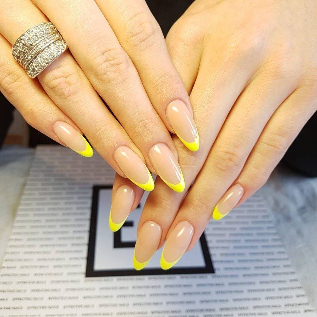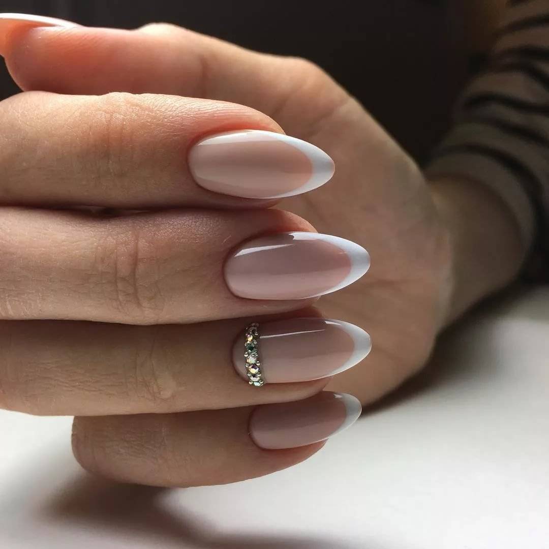 Редко какая женщина теперь в салоне не закажет или дома сама не наложит эту изюминку на свои ногти. Она в стиле нюд – простая в дизайне до невозможности: край ногтей в любом формате отчерчивается любым лаком – контрастирующим с основой или продолжающим его гамму белым окаймлением. В том числе и на пике миндалинок.