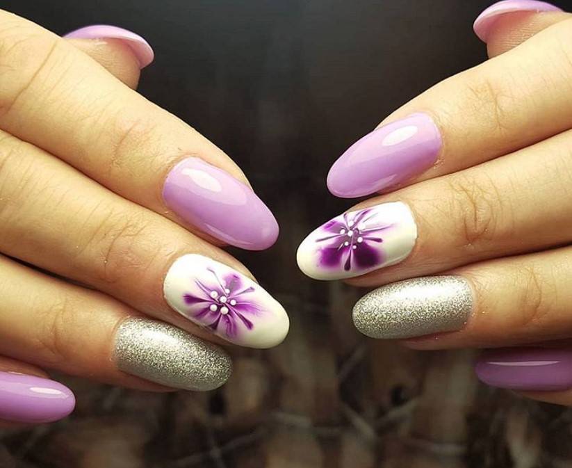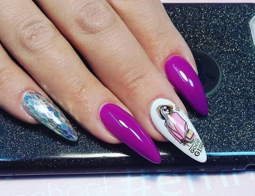 Заостренная форма часто смотрится агрессивно, но правильно подобранный нейл-дизайн поможет исправить эту проблему. Для маникюра лучше выбирать светло-сиреневый цвет.