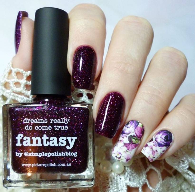 На пике моды — украшение ногтей, покрытых прозрачным лаком, мелкими рисунками. Используйте фиолетовый, чтобы украсить такой маникюр соцветиями сирени, нежными фиалками или другими цветами. Такой узор соответствует последним тенденциям. Другие идеи для фиолетового маникюра с рисунками ищите ниже.