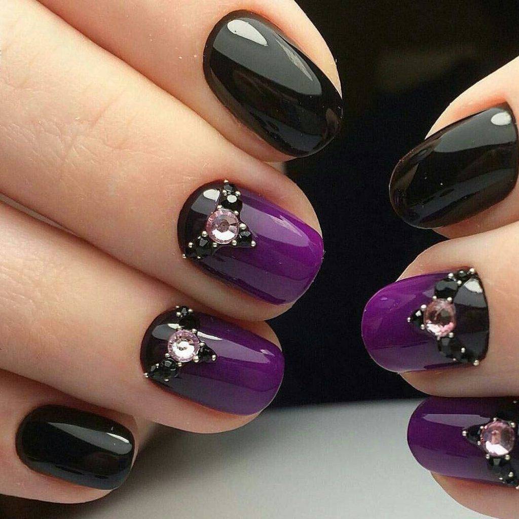 • С рисунком – самые удачные вариации диктуют уместность обособления одного-двух ноготков на фоне однотонной общей массы. Оригинальный узор в виде женственных завитков, цветочной растительности или изысканной геометрии придутся здесь в самый раз.• Со стразами – выделить ноготок островком в виде пирамиды из камешков различных оттенков в зоне лунулы по-прежнему не представляется сложным. Зато выглядит это всегда фешенебельно, стильно, красиво и модно. • С блестками – правильно подобранные оттенки позволят удачно сыграть на контрасте. Серебристый шиммер на белоснежной основе или золотой глиттер на черной базе будут смотреться удачно как на короткой, так и на средней длине ногтей.