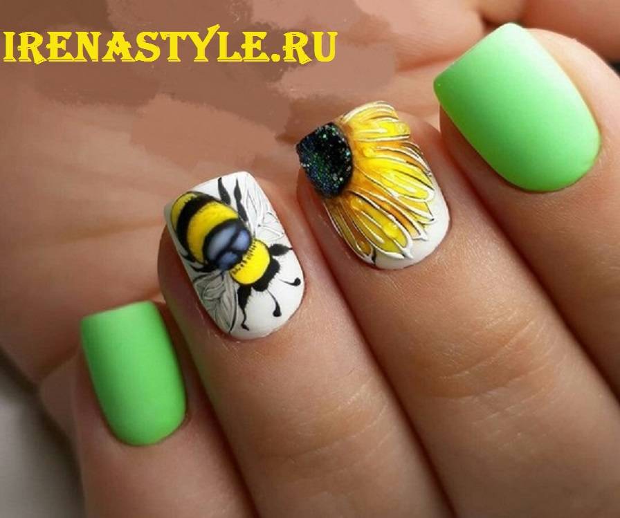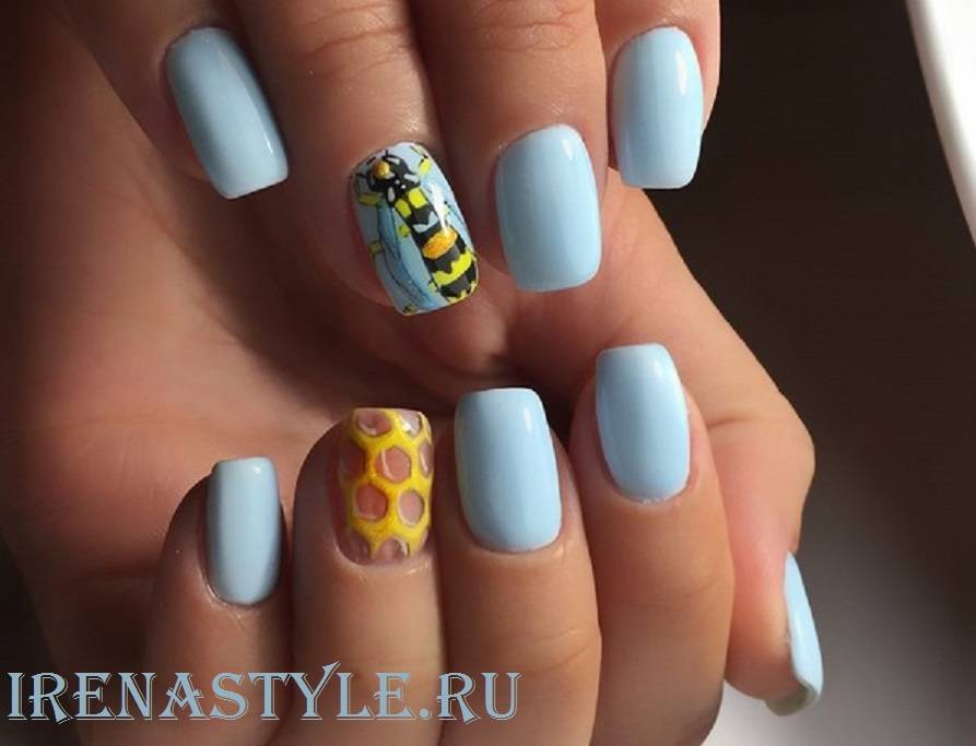 На ногтях пчелы гармонично смотрятся на фоне цветов, трав, сот или других рисунков медовой тематики.