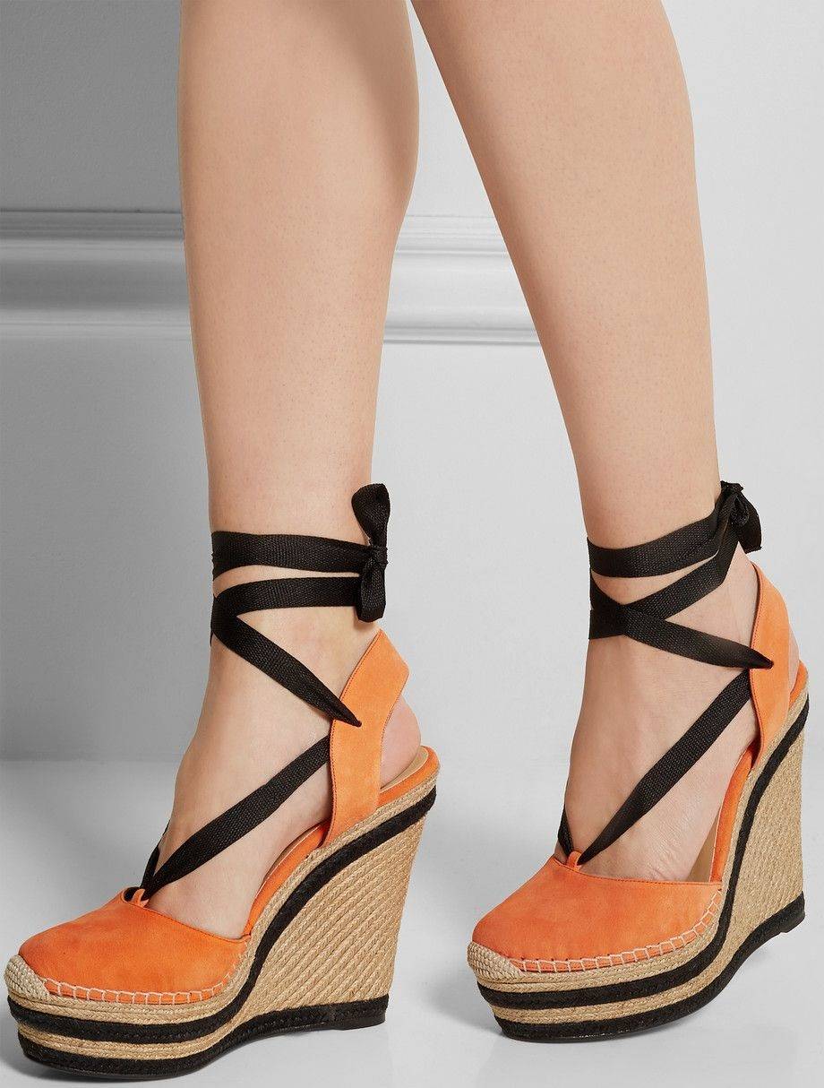 - на танкетке, которая позволяет наслаждаться преимуществом каблуков и комфортом плоской подошвы.