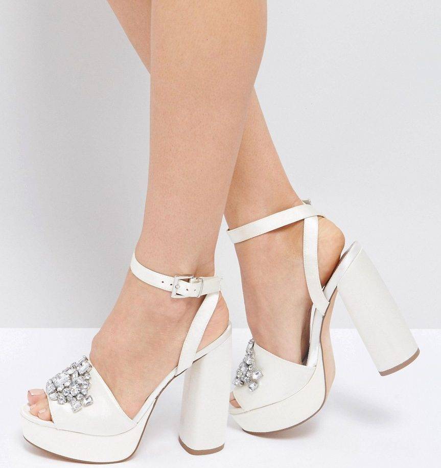 - На каблуке. Бывает высоким, средним или очень низким. Обувь на каблуке не следует слишком украшать стразами и бусинами. Такие босоножки подходят под пышные длинные наряды.