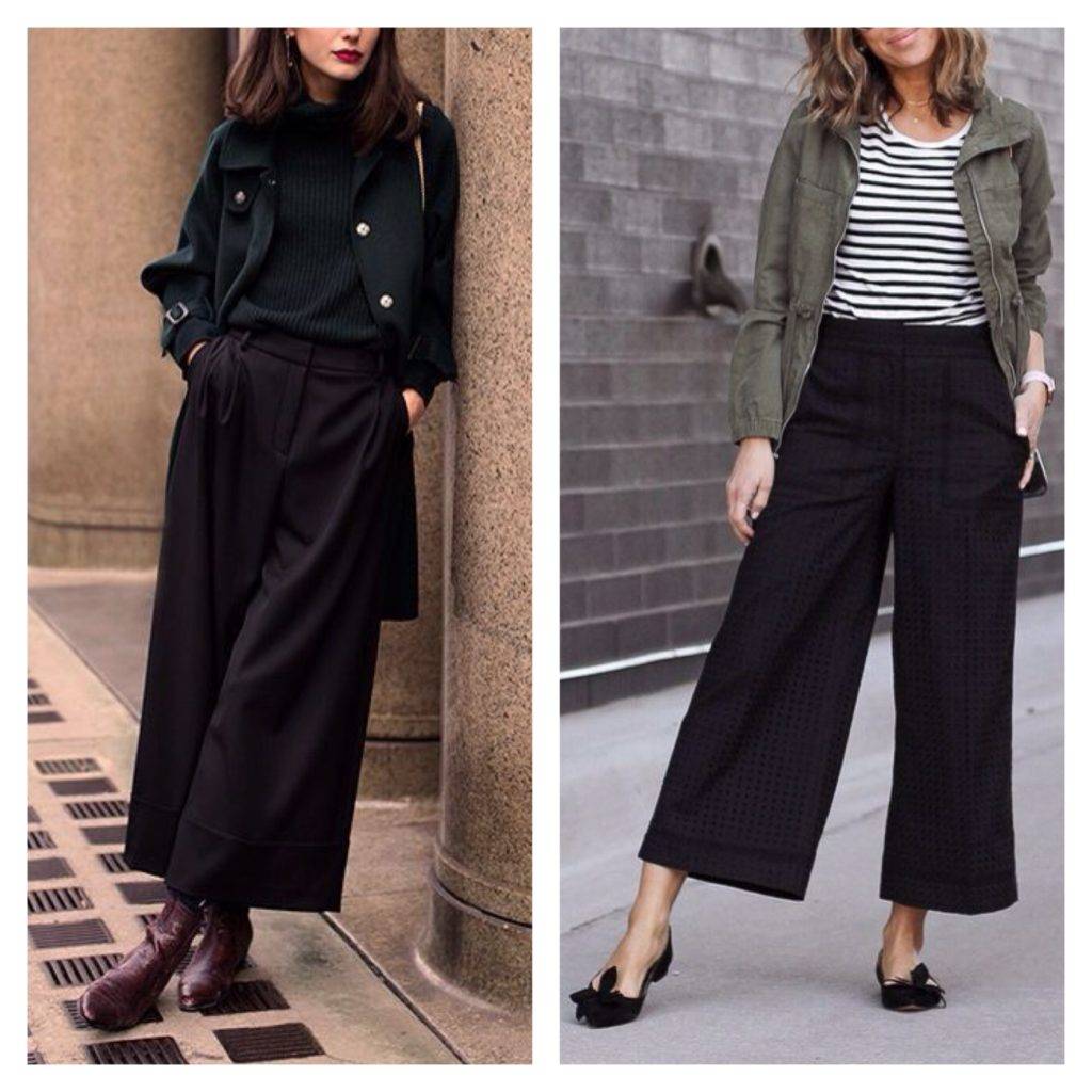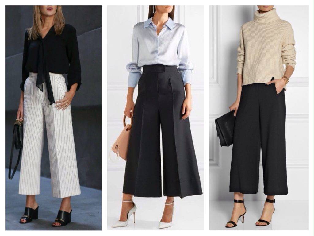 Кюлоты – широкие укороченные брюки. Внешне могут выглядеть как юбка-брюки, в зависимости от силуэта и ткани. Выгодно смотрятся на стройных, девушках высокого роста.
