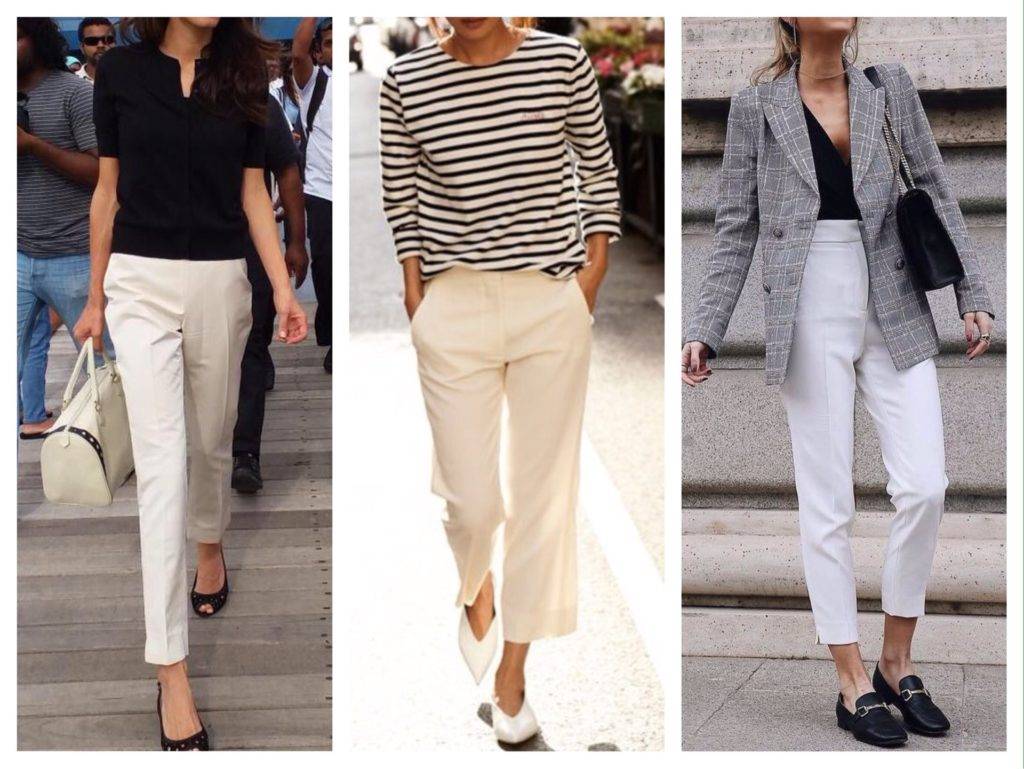 С чем носить такие укороченные брюки летом? С очень элегантной обувью простых фасонов и неизменными футболками.