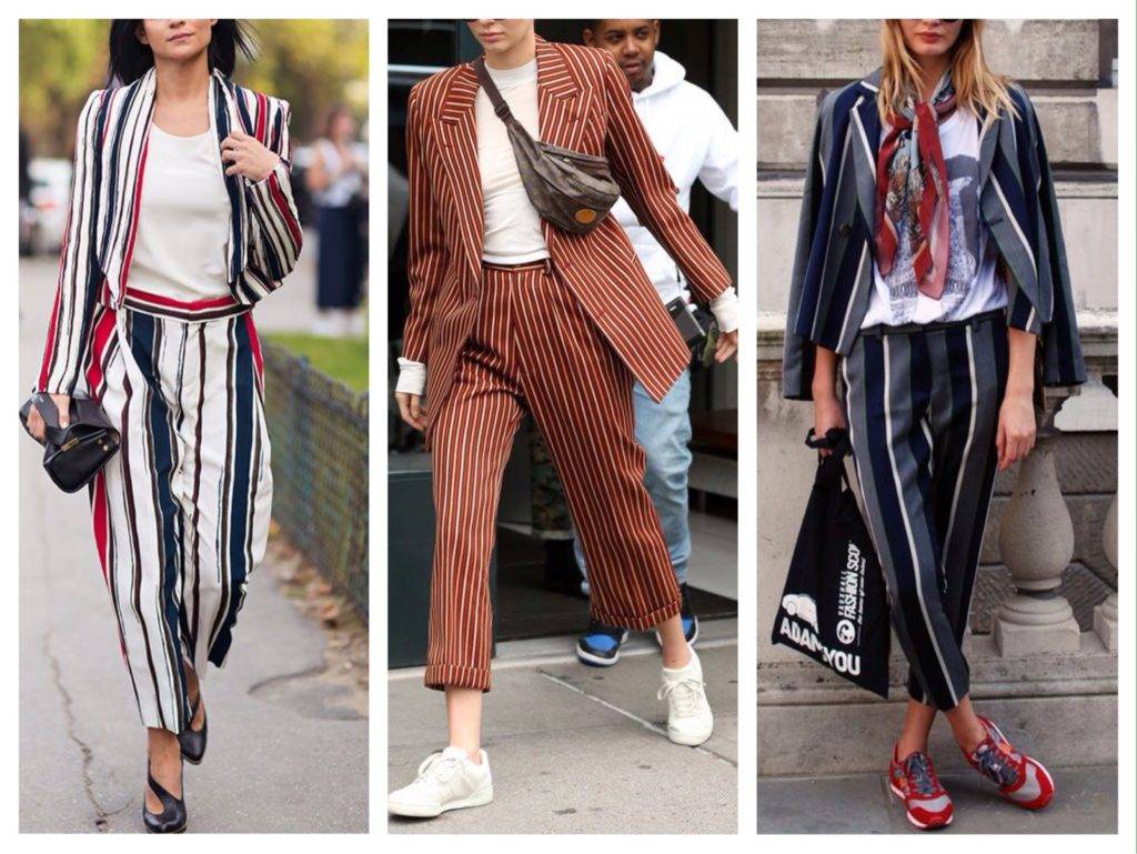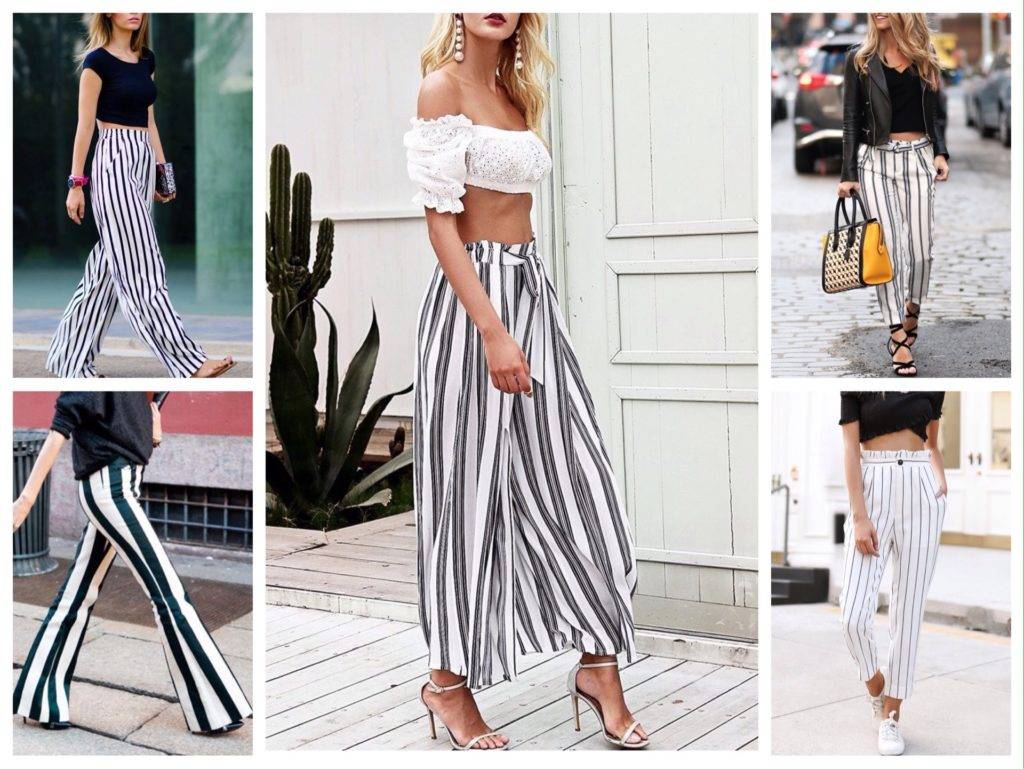 Такая одежда ассоциируется с морским стилем, но будет актуальной и при составлении повседневного или делового аутфита. Зауженные синие брюки в полоску, модели с высокой талией и кюлоты освежат внешний вид, сделают ножки визуально длиннее и стройнее.
