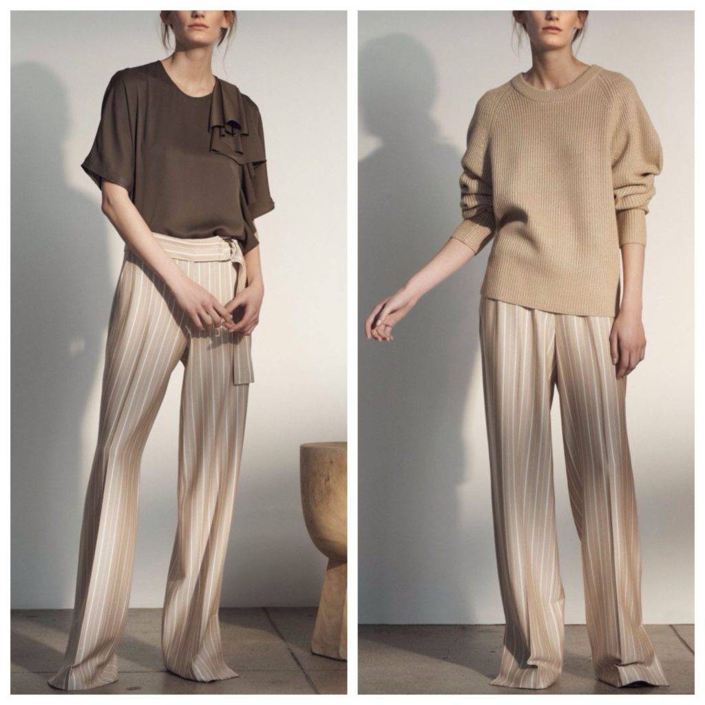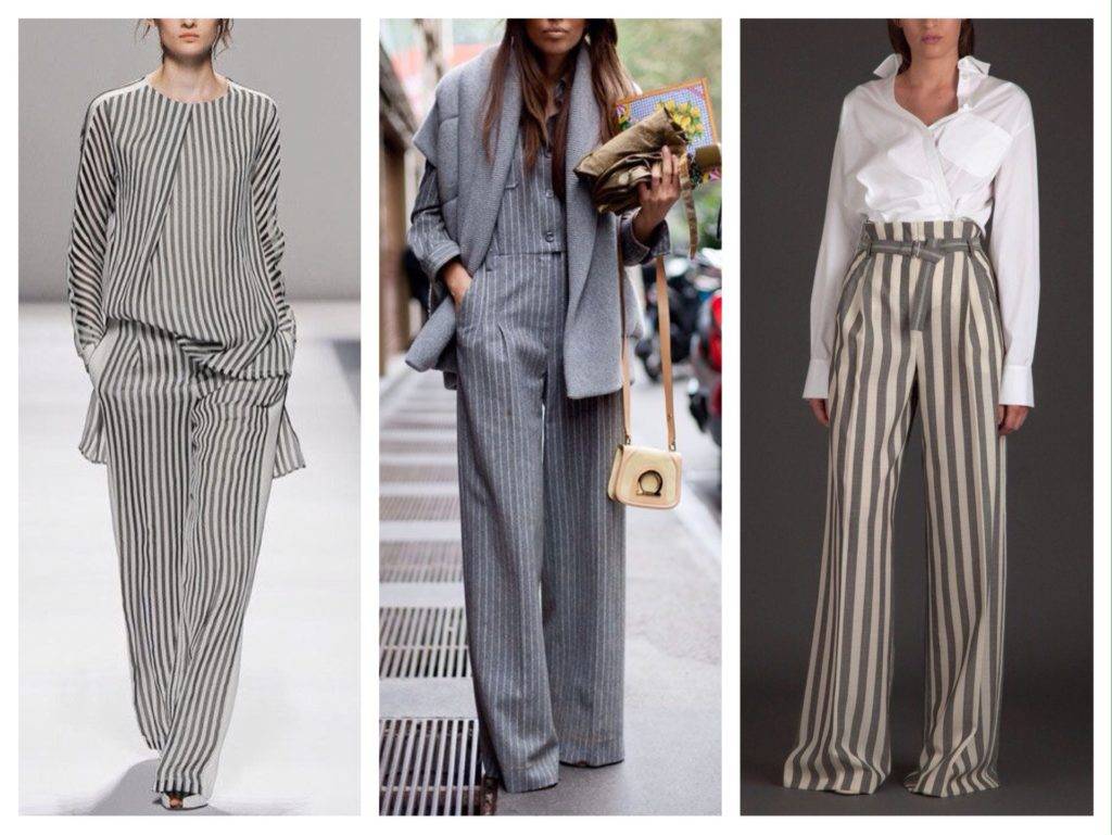 Все без исключения могут выбирать монохромные женские брюки в полоску бледных тонов, модели с лампасами и брюки в мелкую полоску, как на фото.