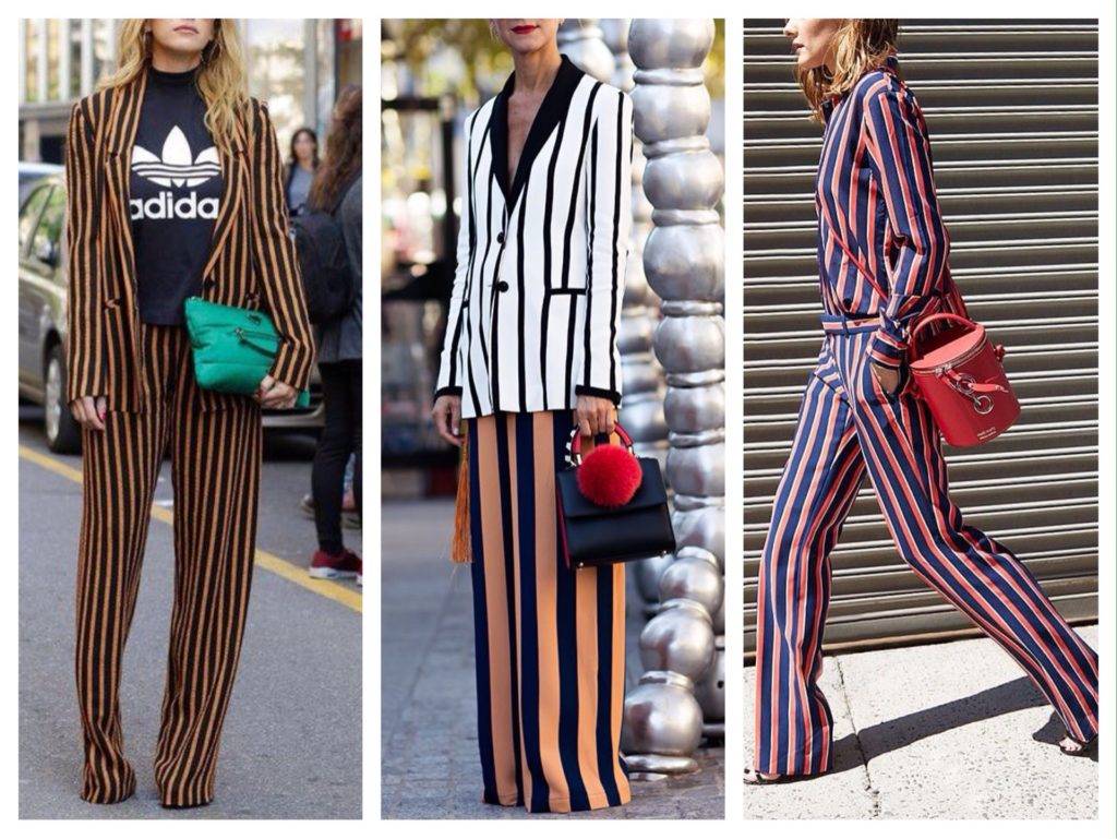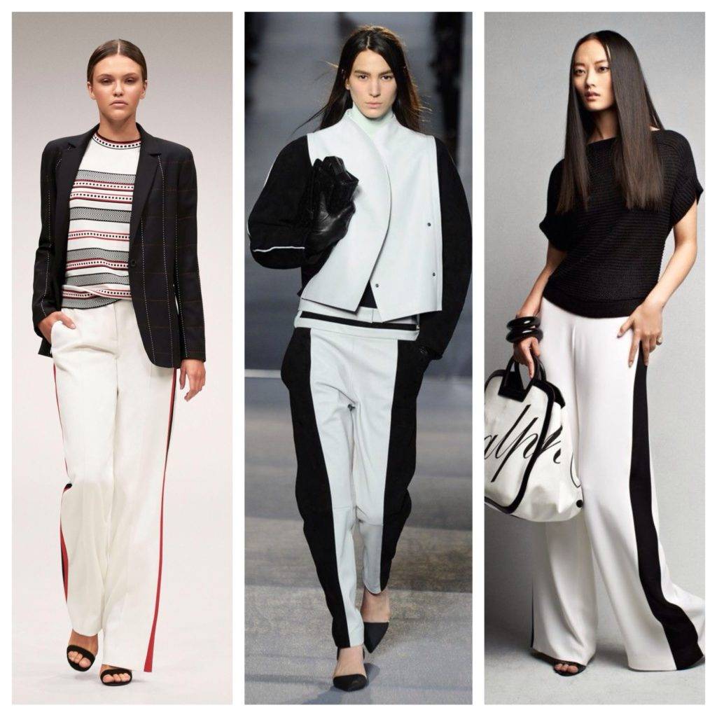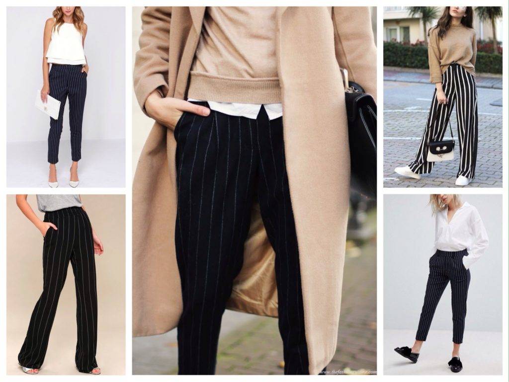 Такой вариант подойдет для фона любой палитре оттенков. Востребованными остаются черные брюки в белую полоску. Кроме этого черные линии могут комбинироваться с серыми, красными и любыми другими.
