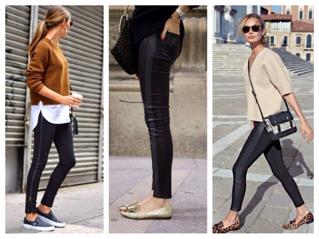 - Кожаные брюки и леггинсы. Их оценят смелые и уверенные в себе девушки. Лампасы в подобных моделях делают неконтрастными. Нужно тщательно продумать образ, чтобы не выглядеть вульгарно.