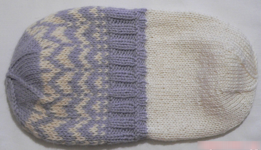 - Следующие 10 см вяжем лиловой нитью, через 5 см начинаем убавлять петли. Шапку можно сделать длиннее, если провяжем основного узора на 10-15 см больше, чем указано в схеме работы.